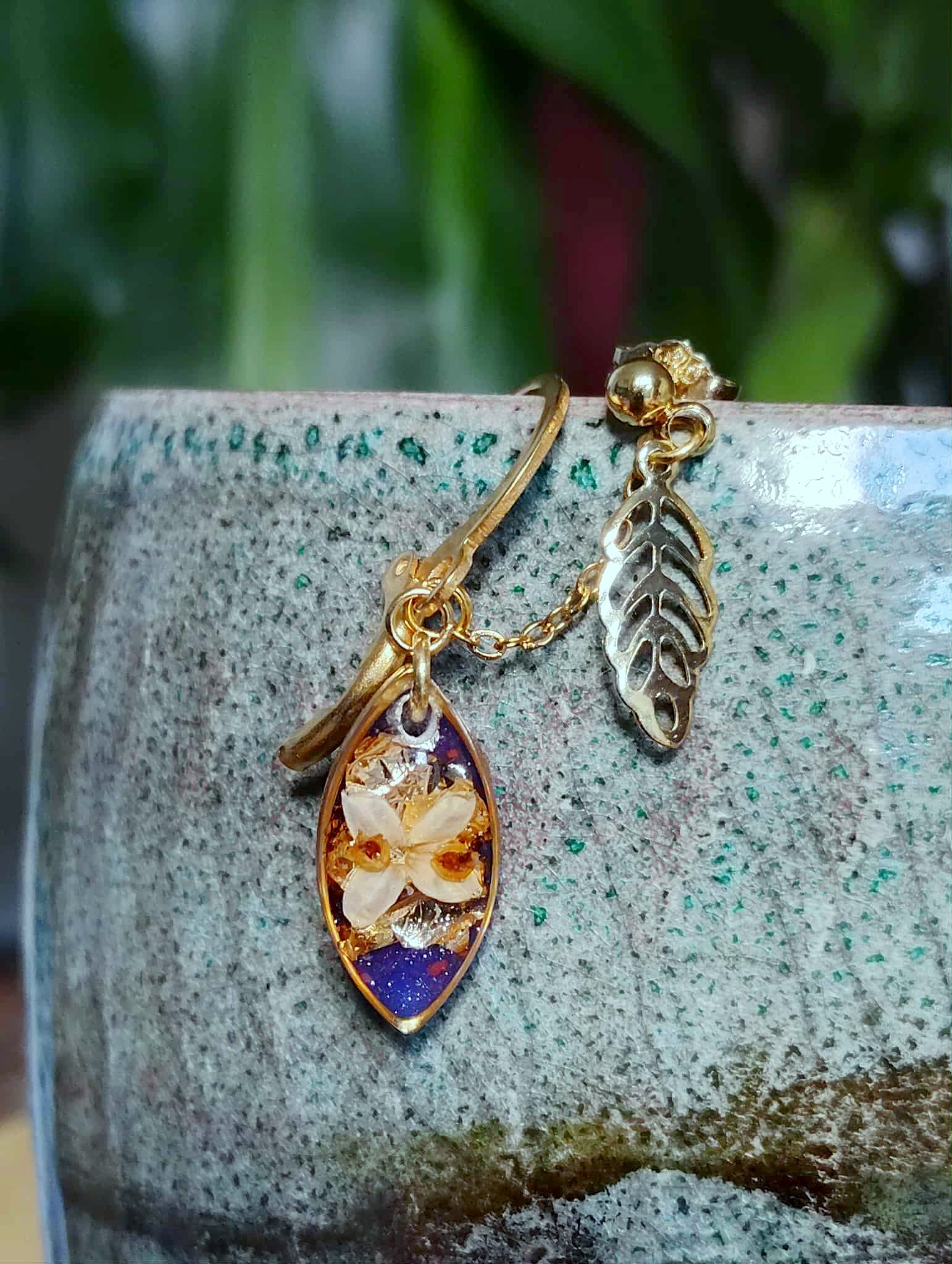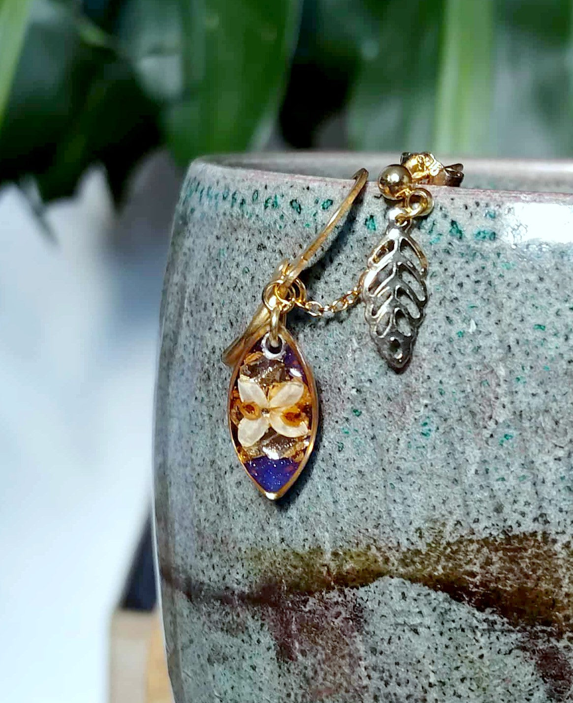 Les attaches sont une créole d'un cm de diamètre pour le premier trou et d'un clou perle pour le deuxième trou, accompagné d'une breloque feuille, le tout en acier inox dorée