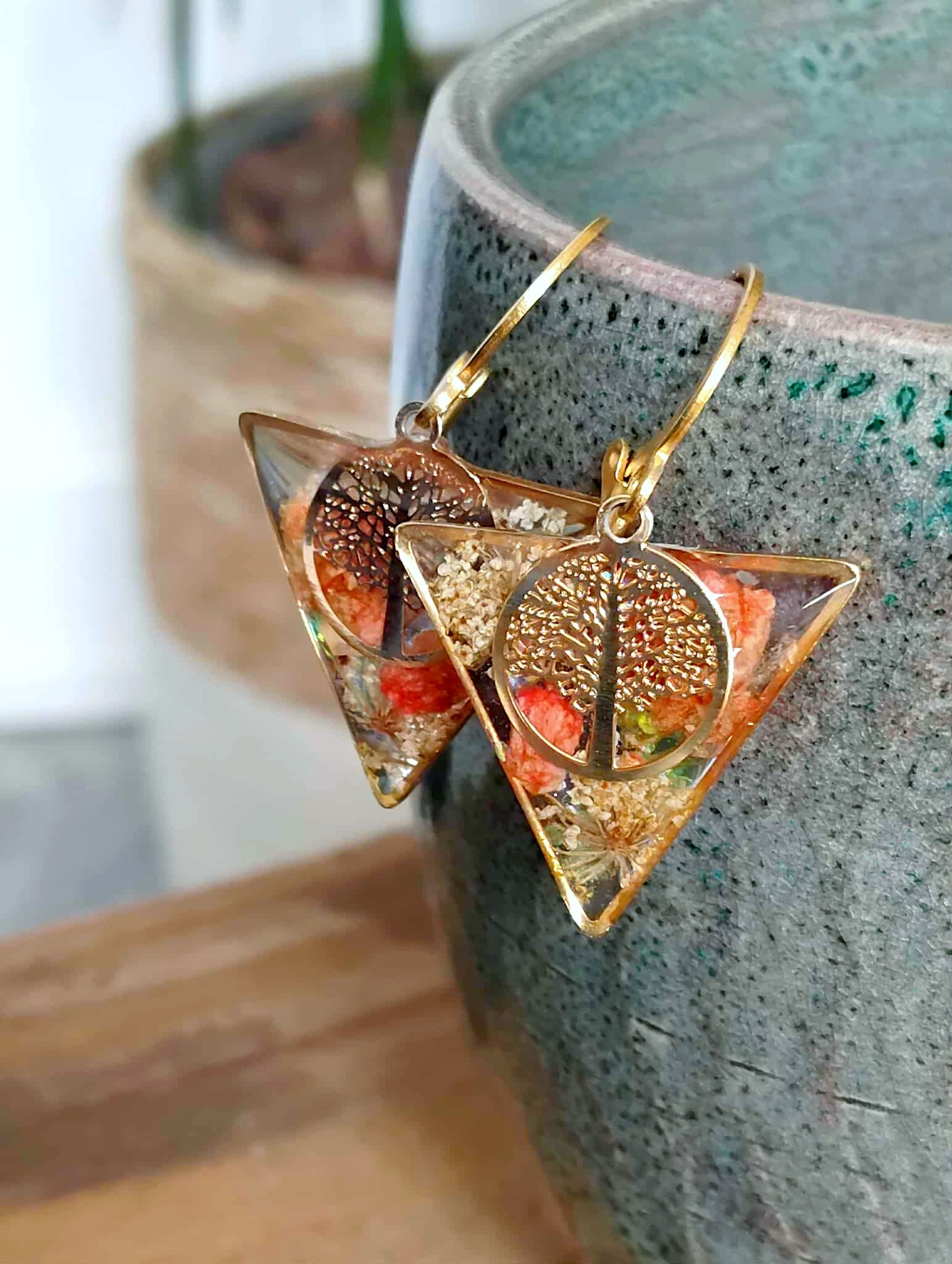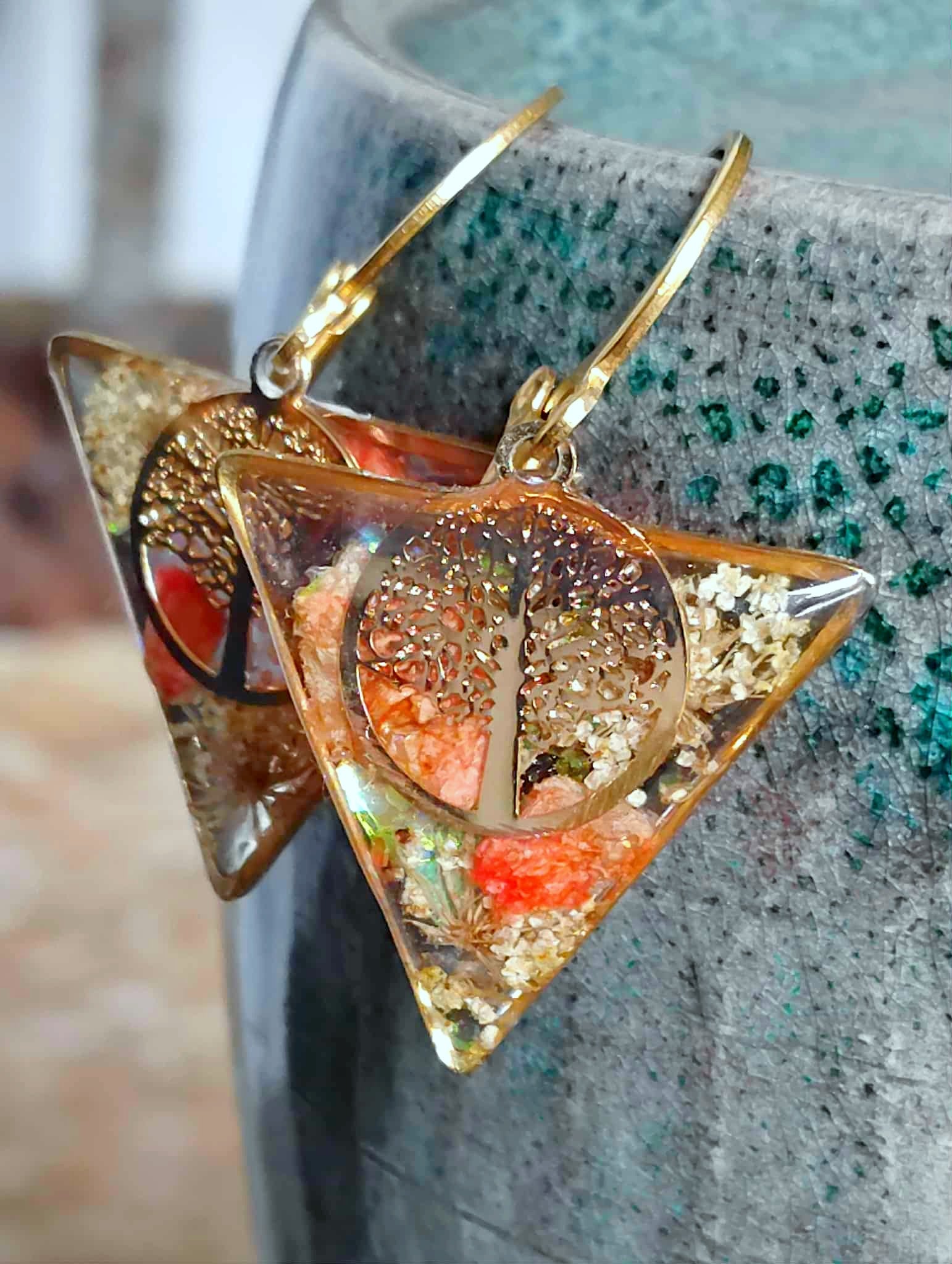 Les pendentifs triangle de 2cm de long sont recouverts de résine époxy de marque française et de haute qualité