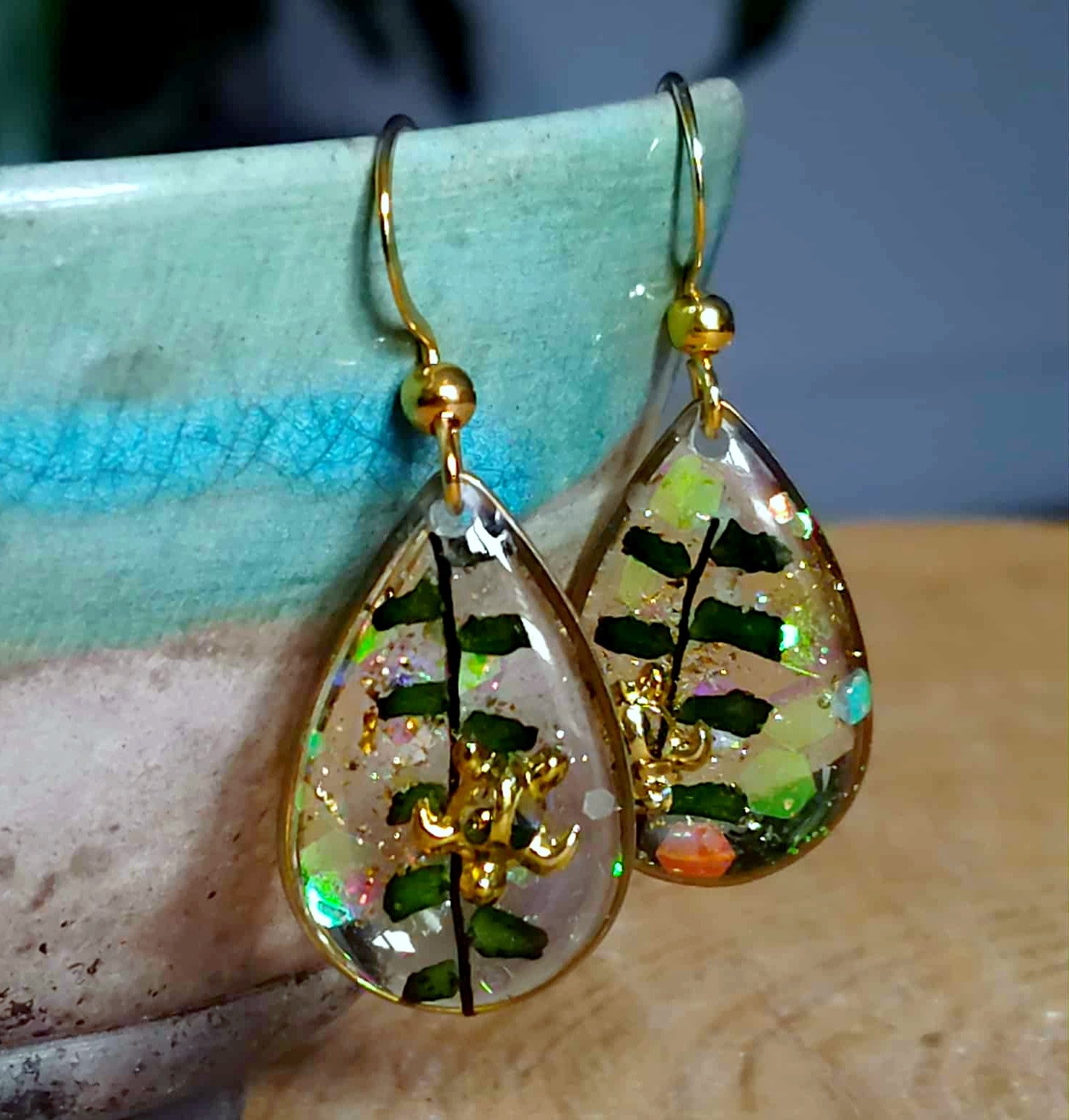 Les pendentifs goutte de 2 cm de long sont recouverts de résine époxy de marque française et de haute qualité