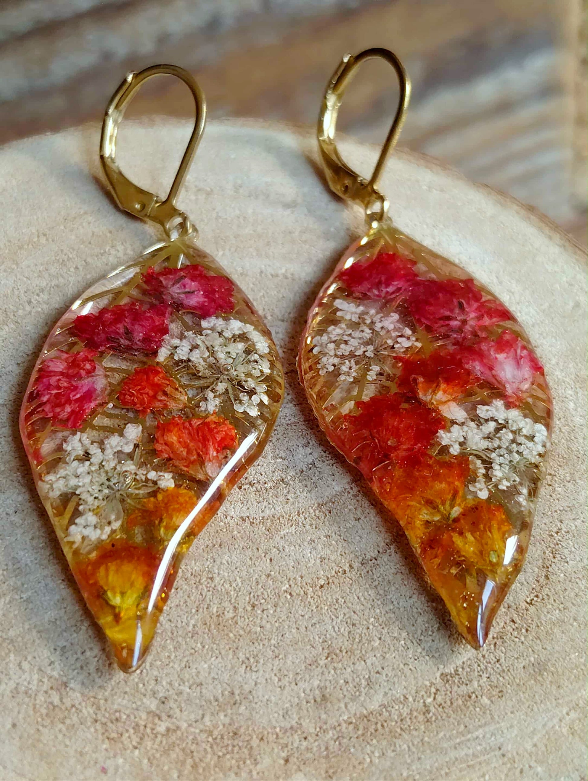 Les pendentifs feuilles de 4 cm de long sont recouverts de résine époxy de marque française et de haute qualité