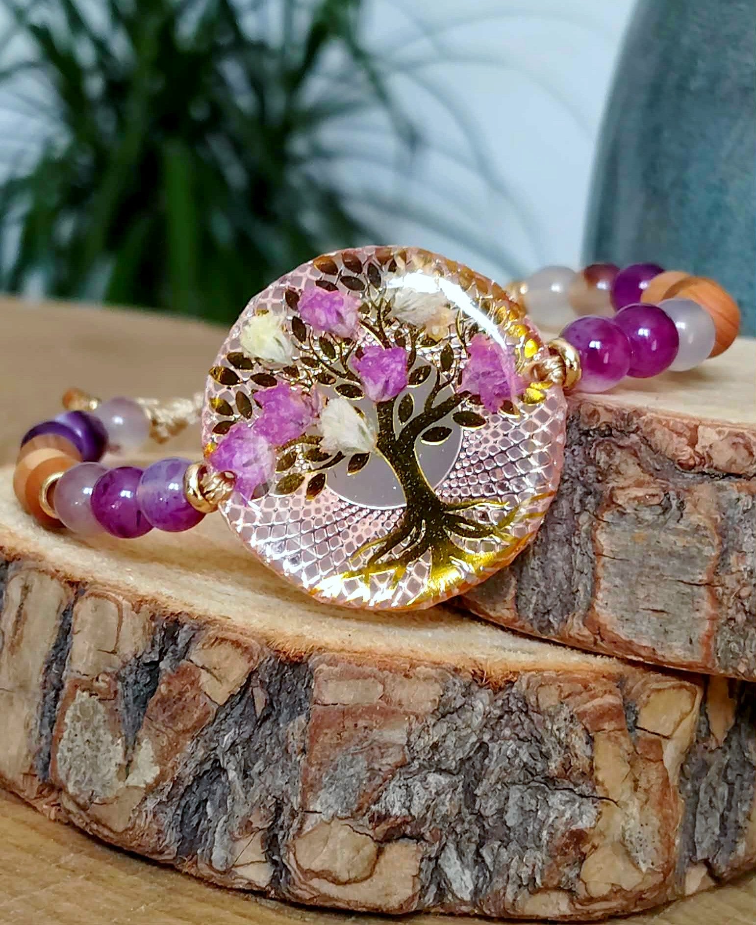 Il est accompagné de 12 perles d'agate ( 6mm),de 8 perles en bois de cyprès ( 6mm) et de 8 perles en acier inoxydable doré