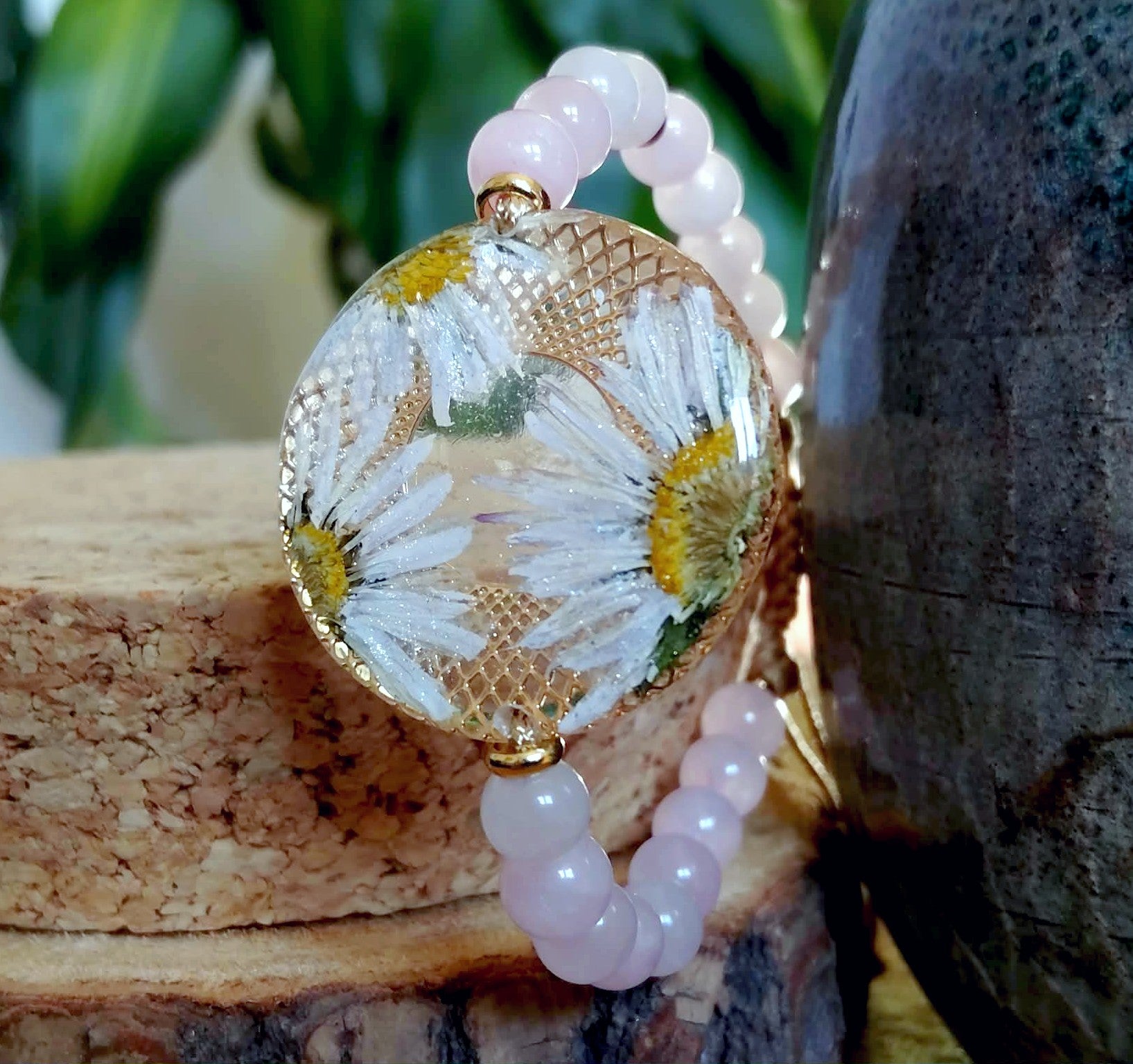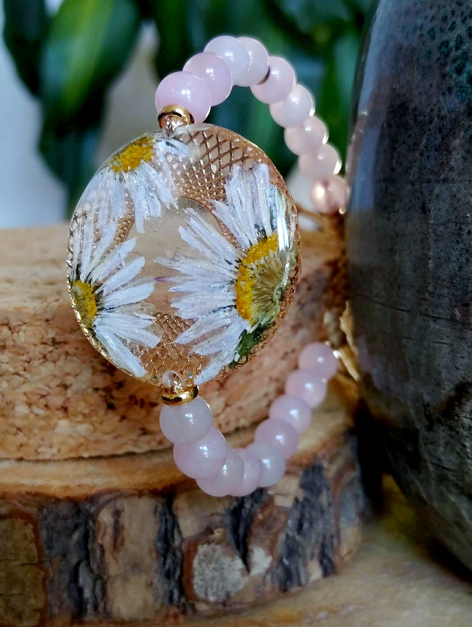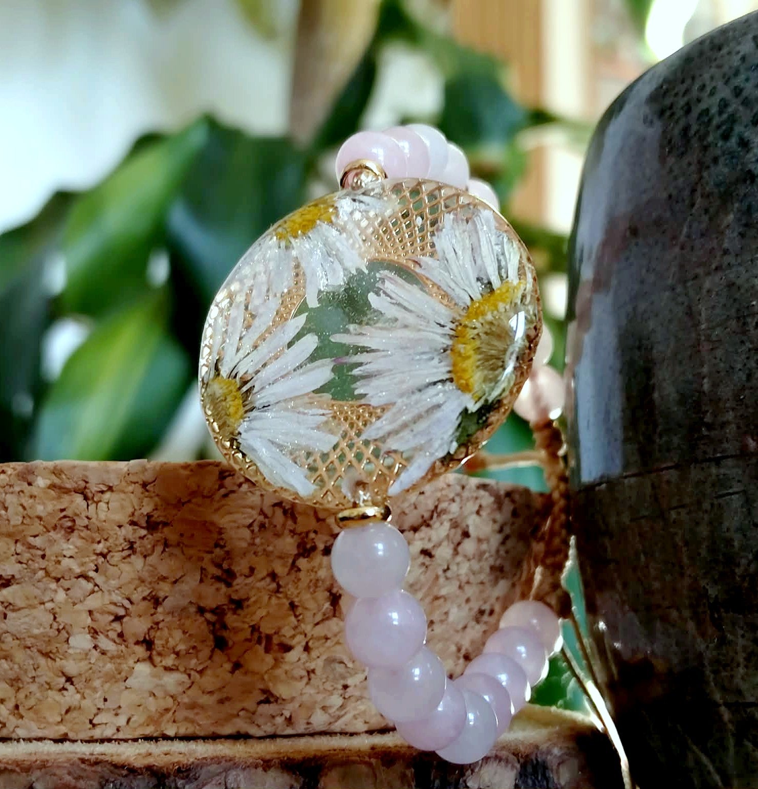Il est accompagné de 18 perles de quartz rose( 6mm) et de 8 perles en acier inoxydable
