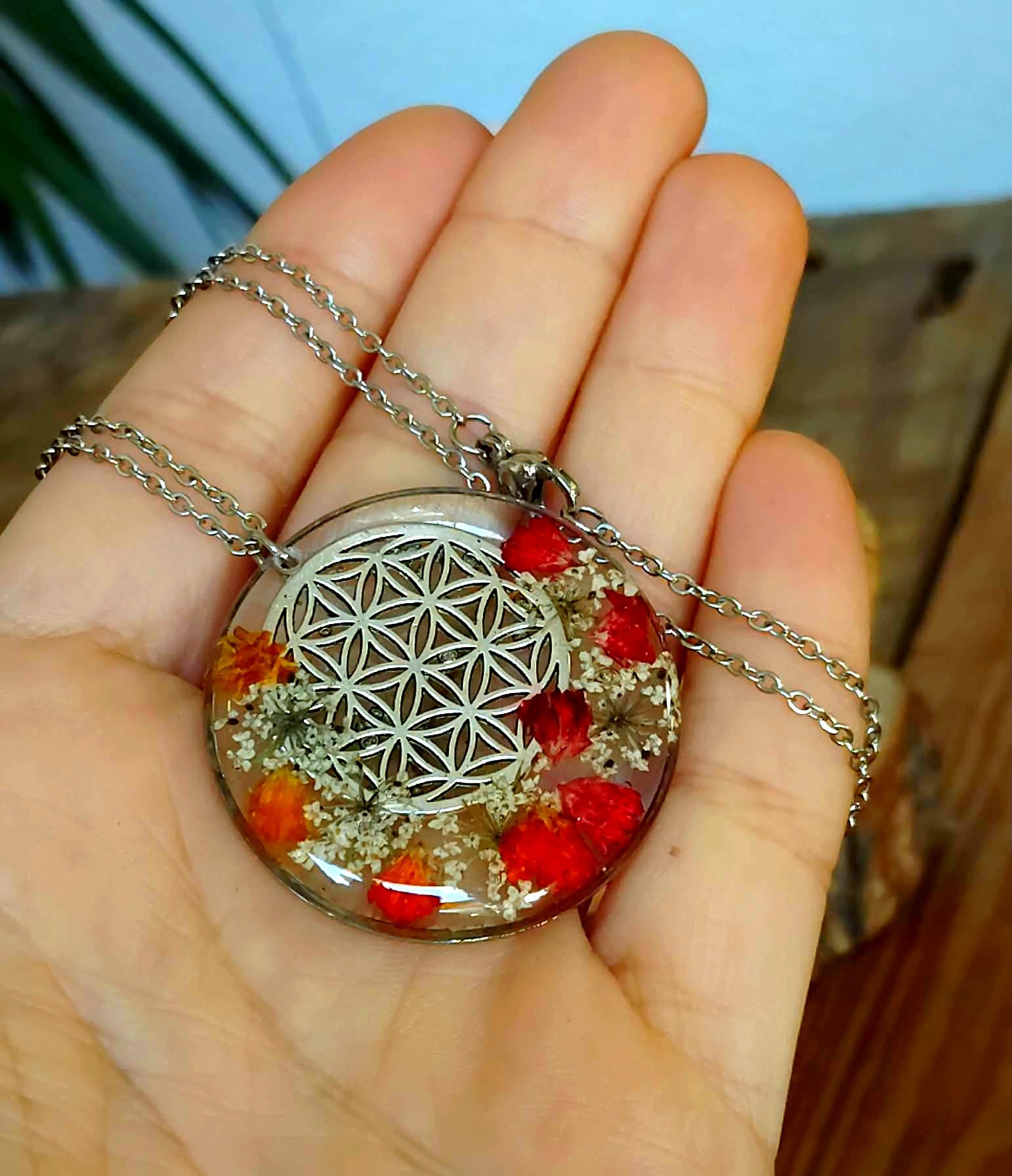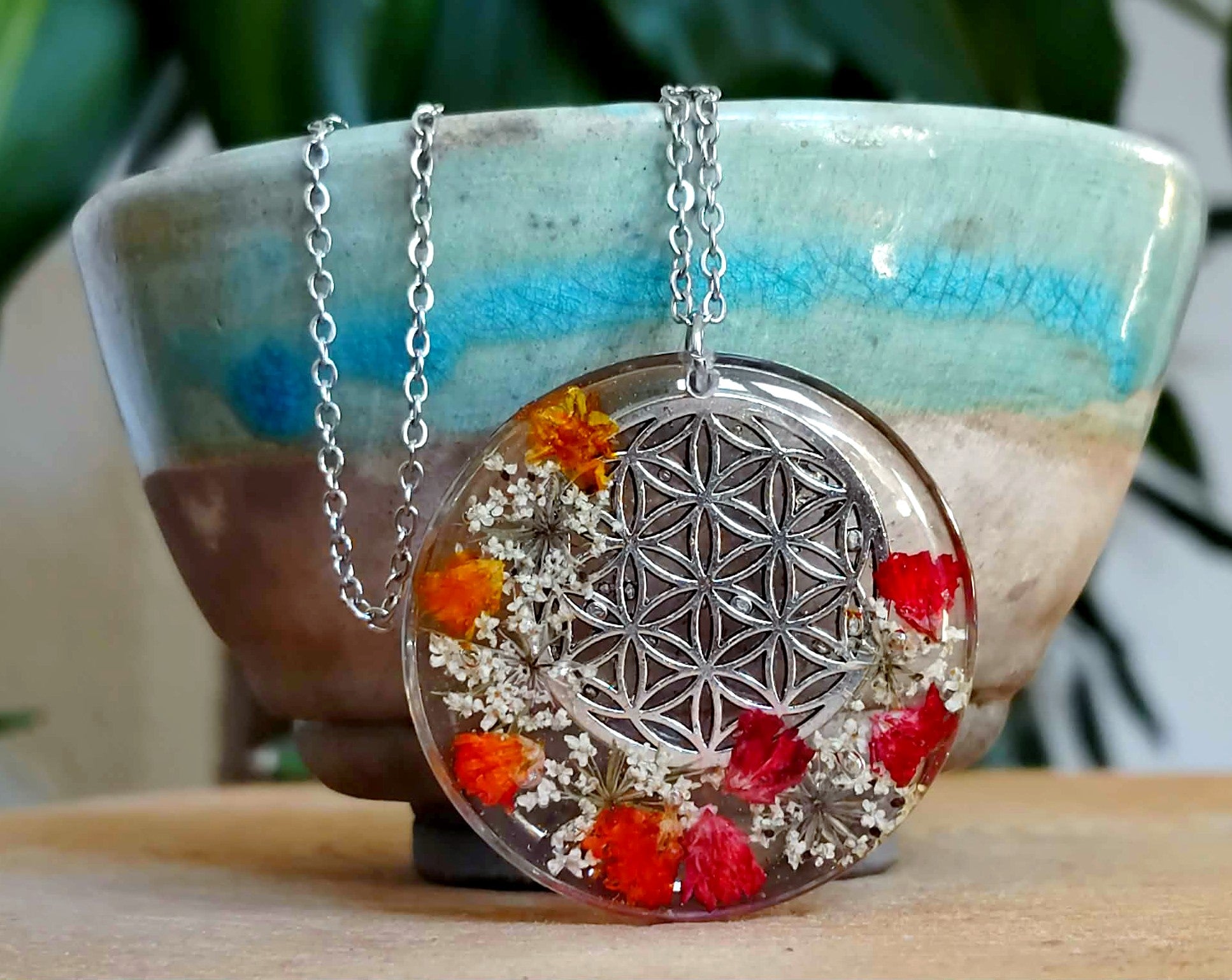 Le pendentif cercle de 4 cm de diamètre est en acier inox motif fleur de vie recouvert de résine époxy de marque française et de haute qualité