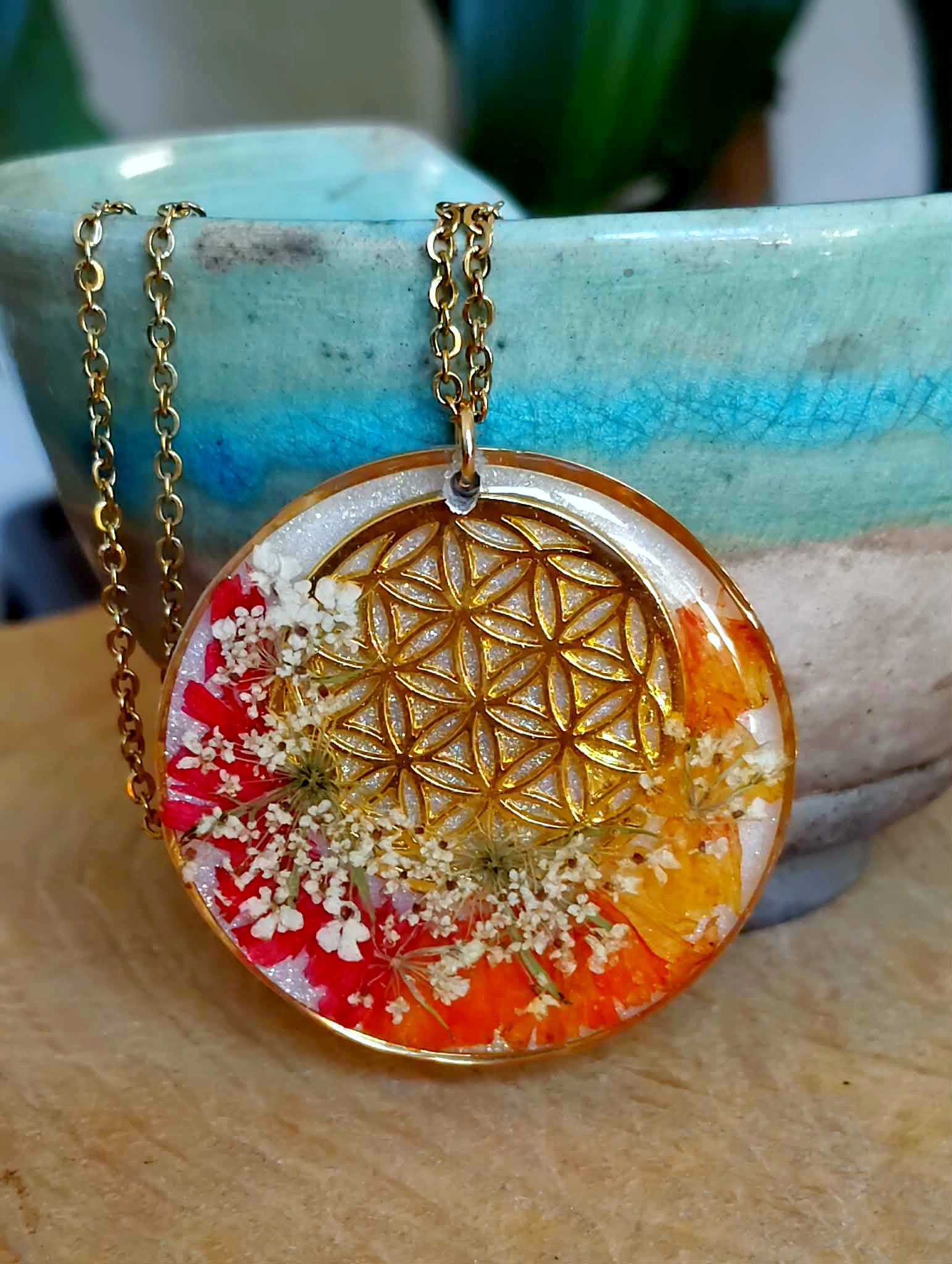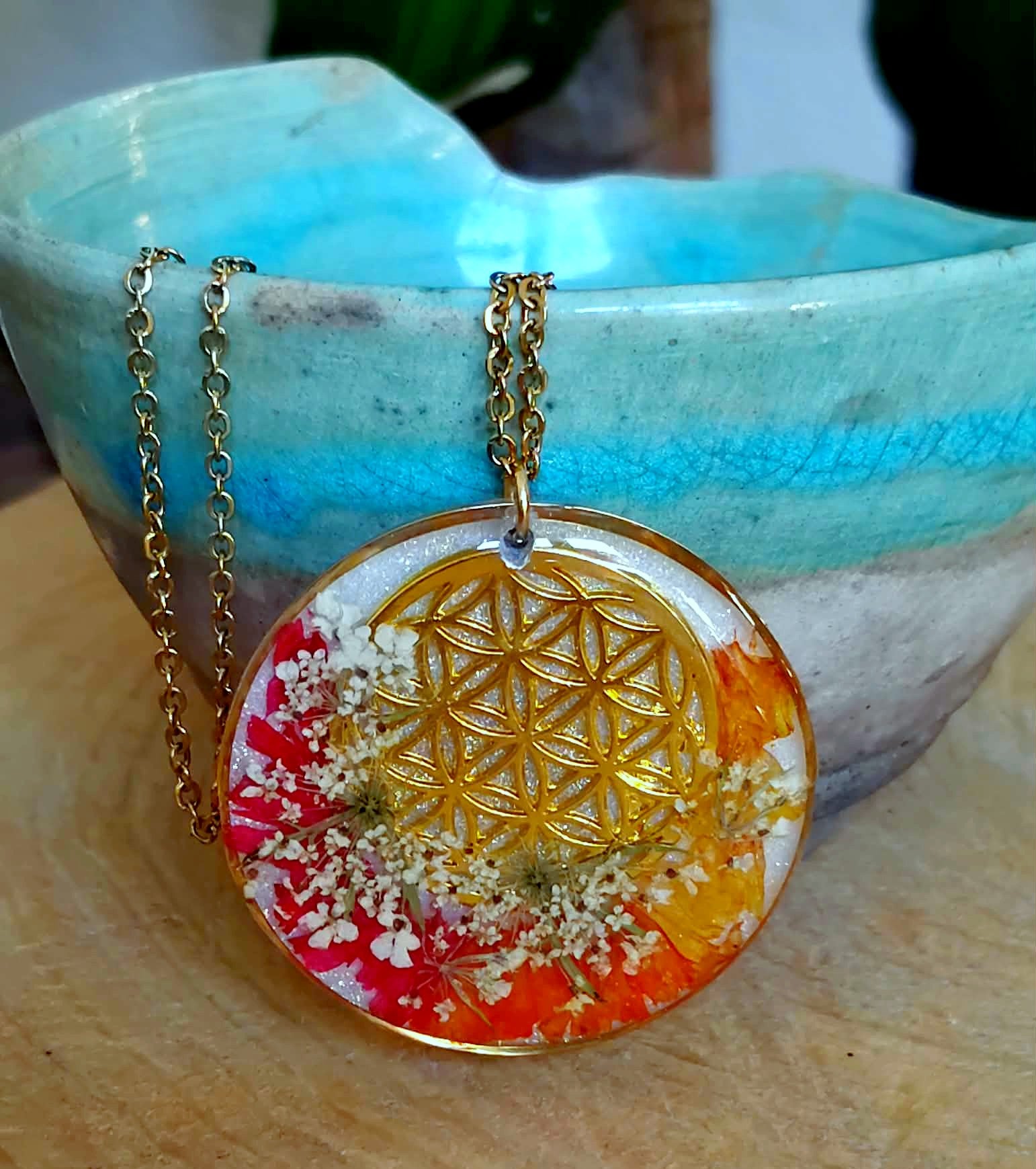 Le pendentif cercle de 4 cm de diamètre est en acier inox motif fleur de vie recouvert de résine époxy de marque française et de haute qualité