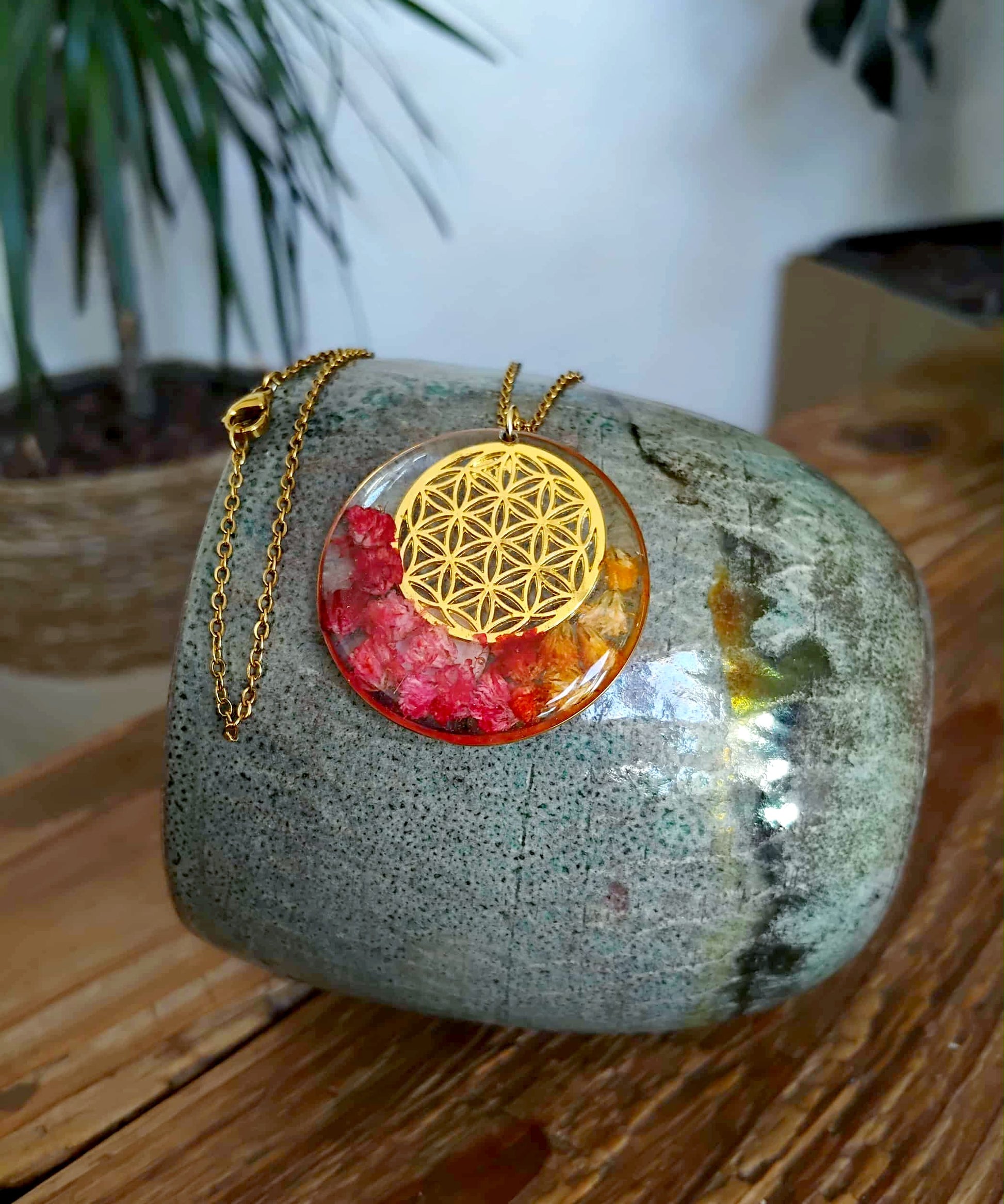 Le pendentif cercle de 4 cm de diamètre est en acier inox motif fleur de vie recouvert de résine époxy de marque française et de haute qualité