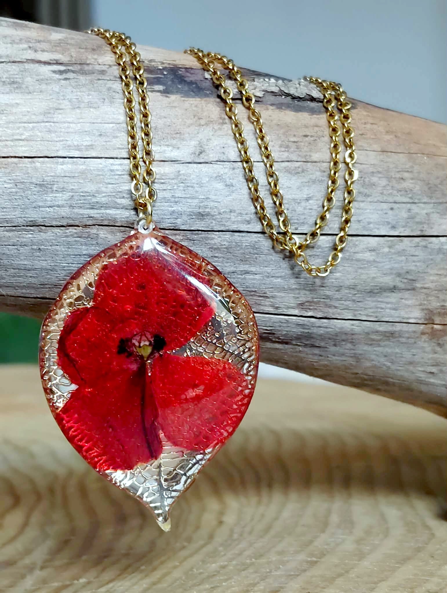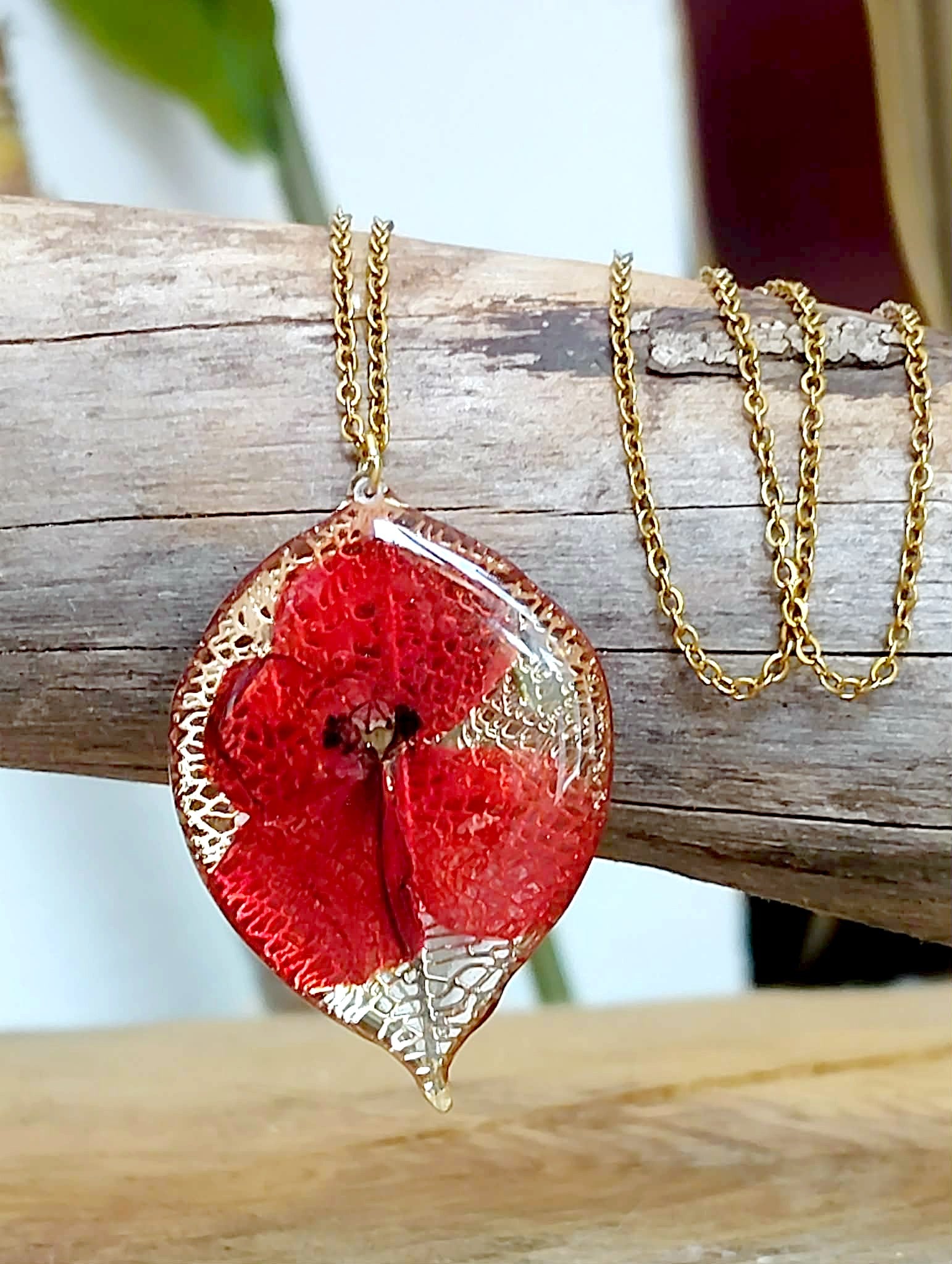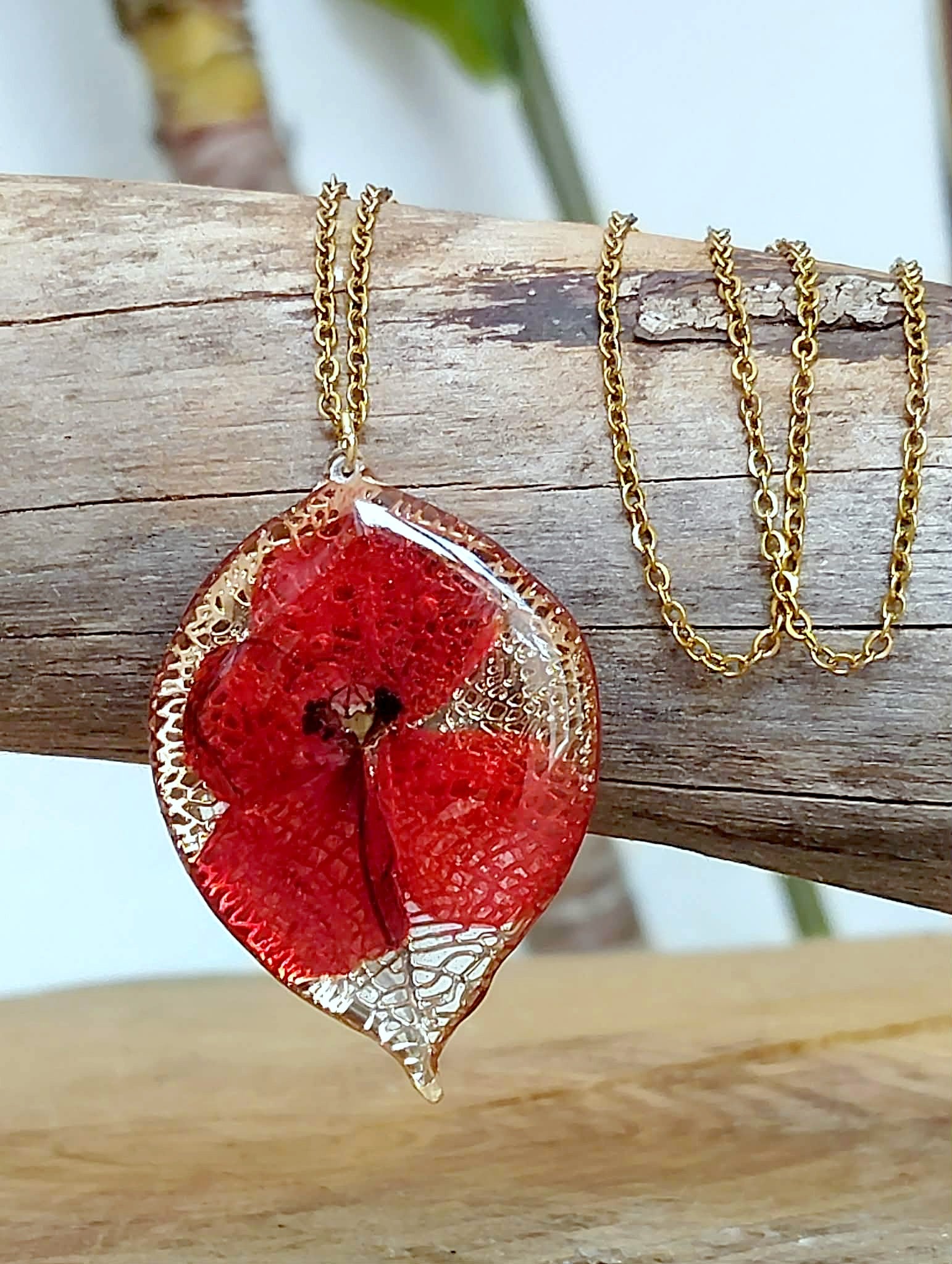 Pendentif feuille de 4,5 cm de long en acier inox recouvert de résine époxy de marque française et de haute qualité
