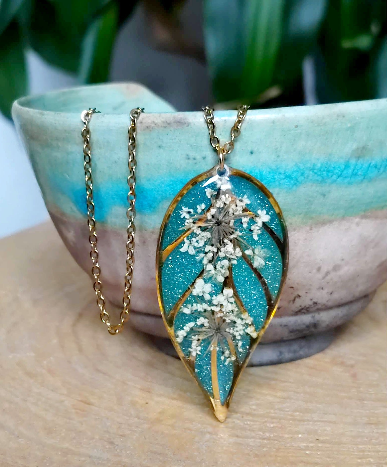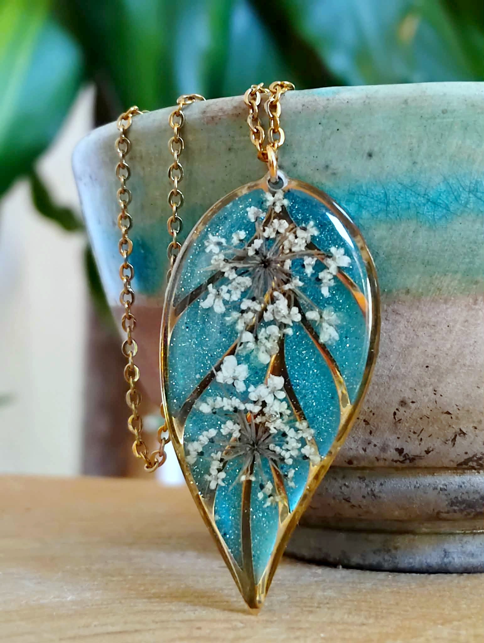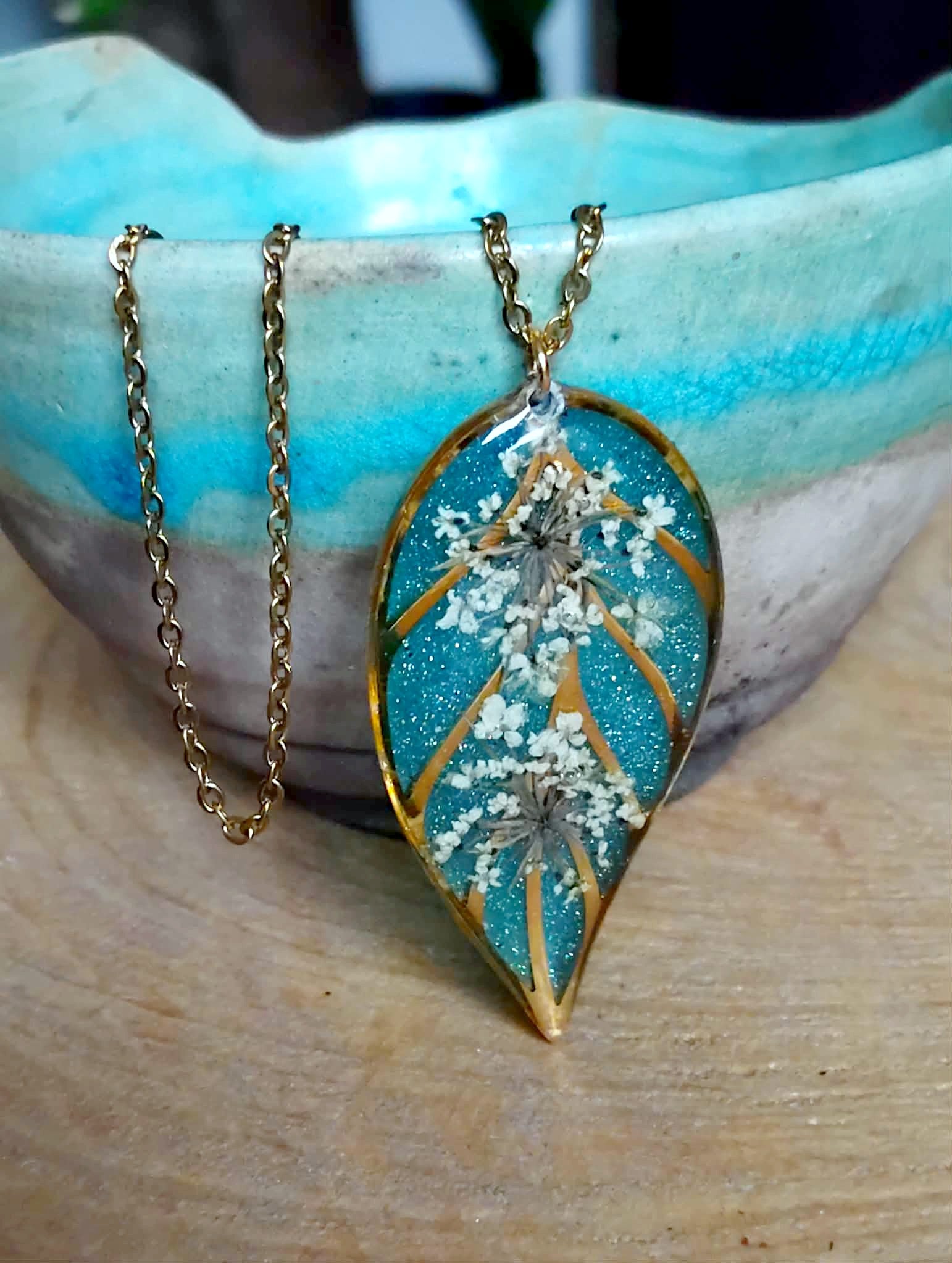 Pendentif feuille de 4 cm de long en acier inox recouvert de résine époxy de marque française et de haute qualité