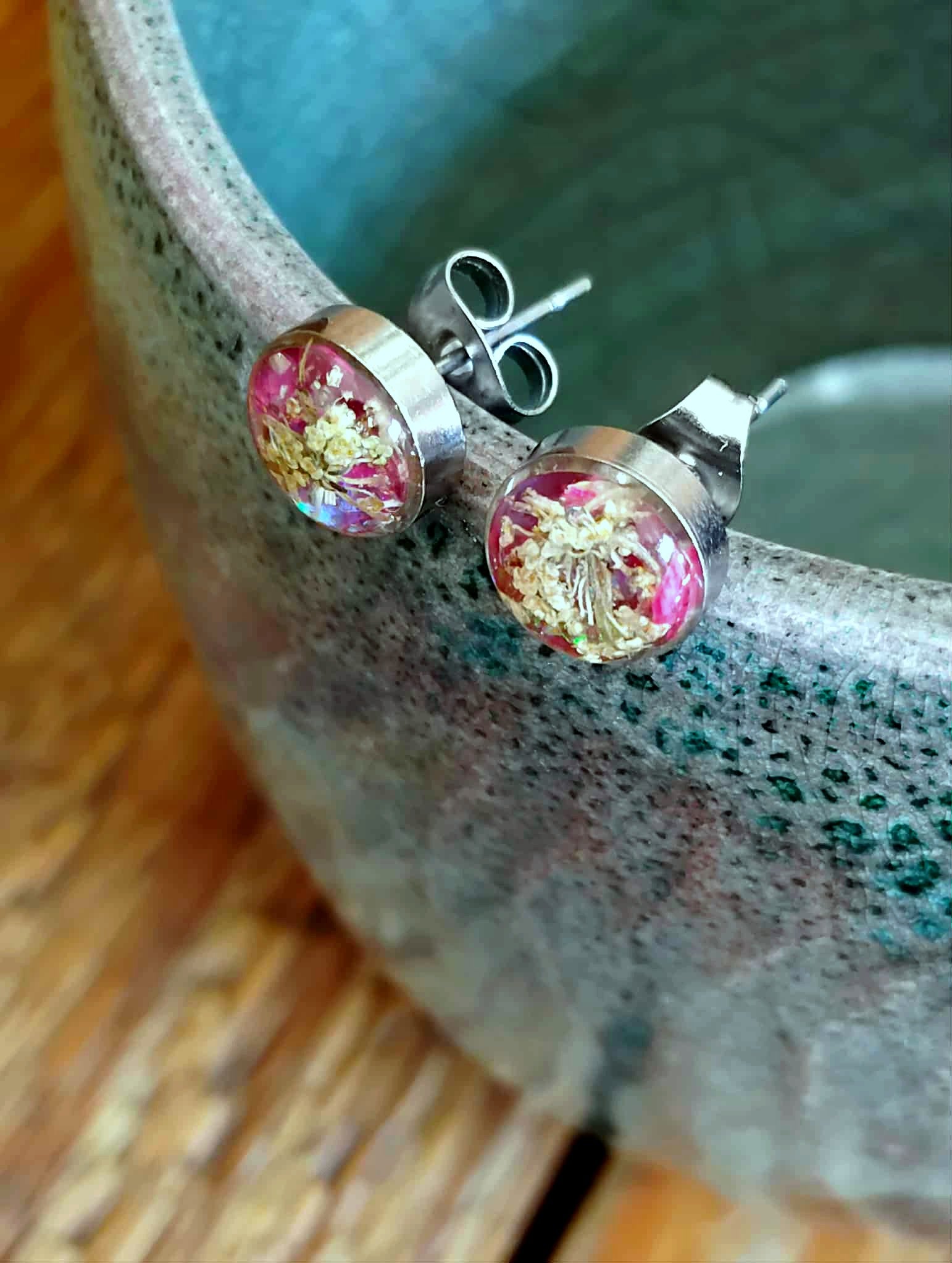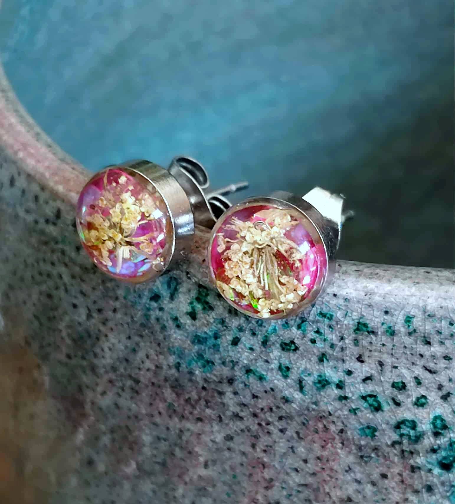 Les clous 6mm de diamètre sont composés d'un éclat de fleur de carotte sauvage et de paillettes à reflet figés dans la résine époxy (de marque française et de haute qualité)