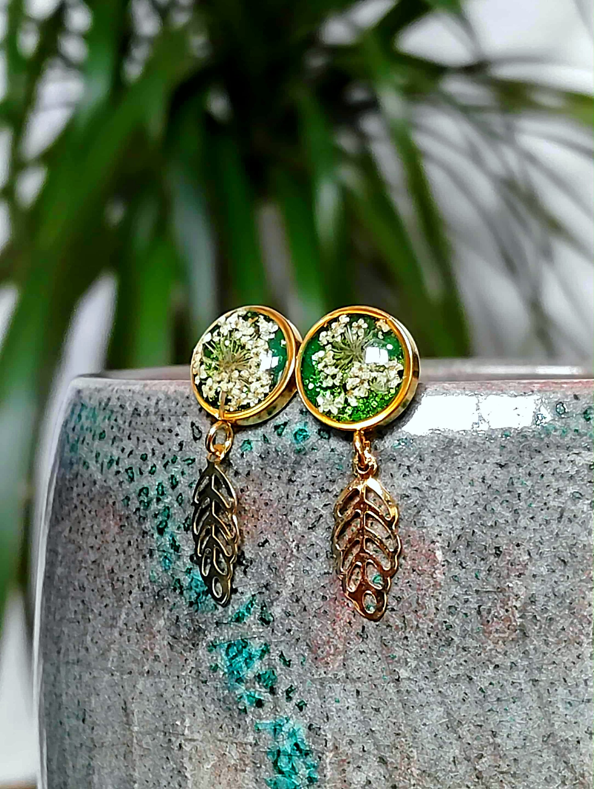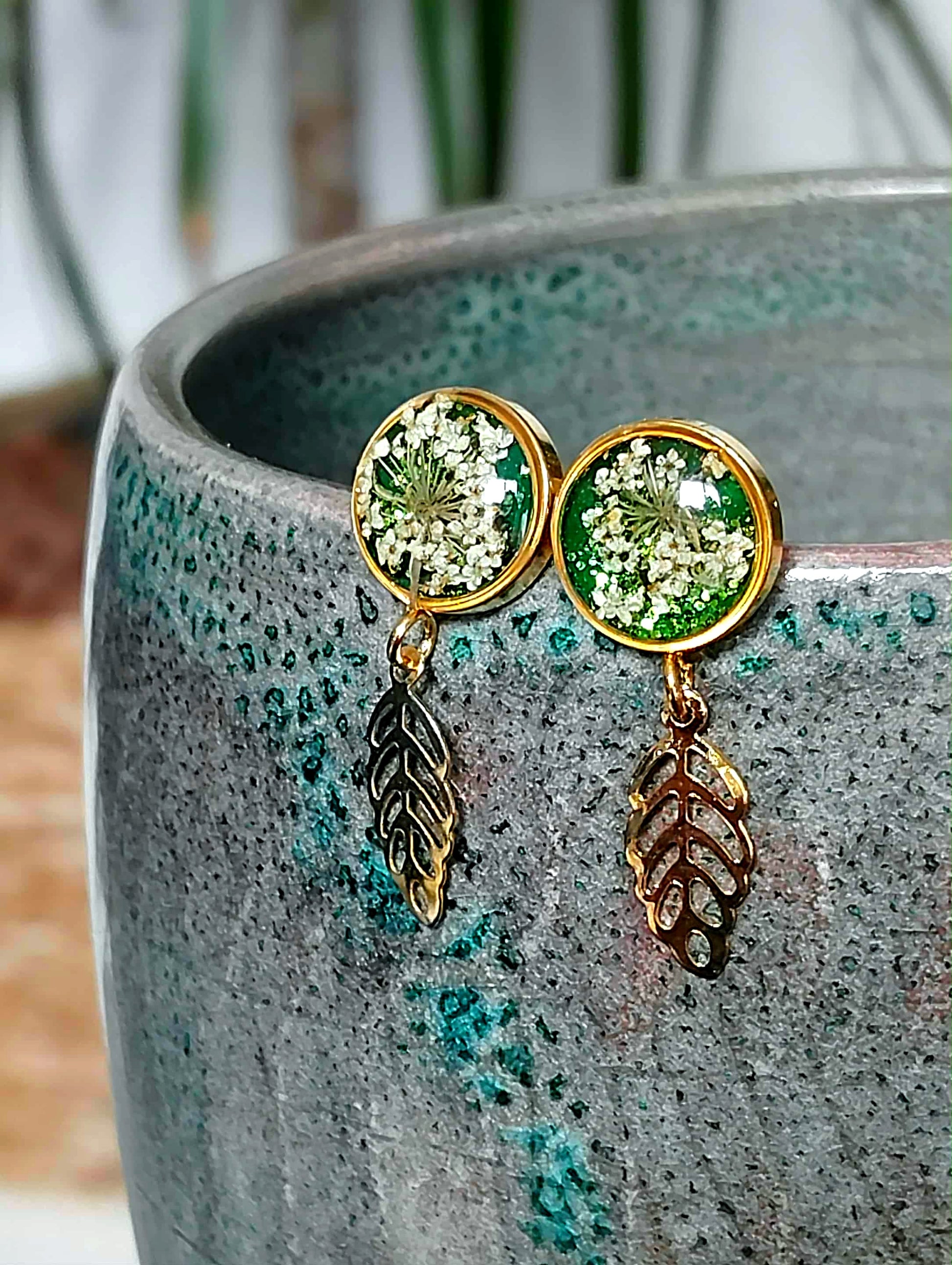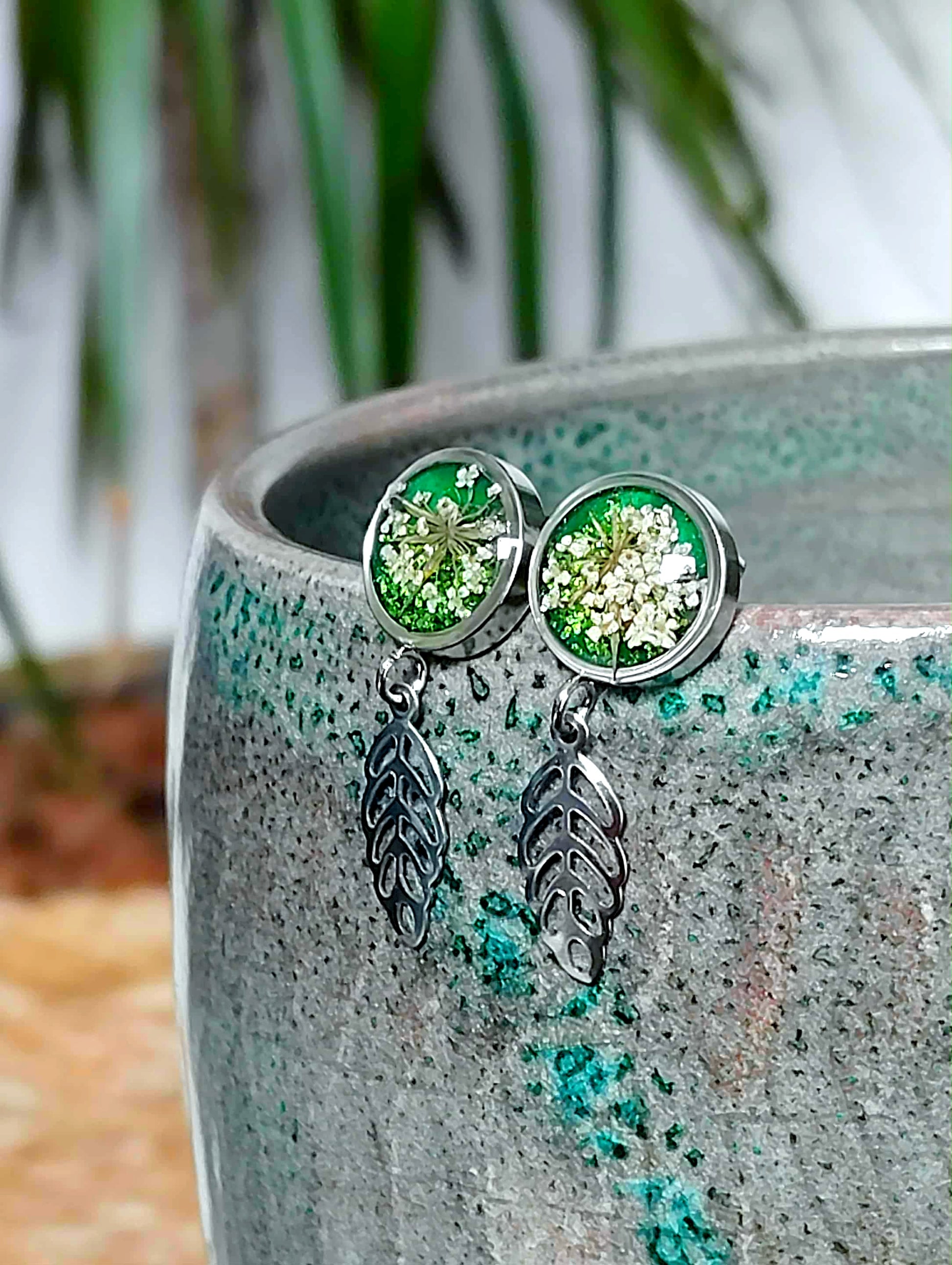 Les clous 8mm de diamètre sont composés d'un éclat de fleur de carotte sauvage et d'un fond vert avec paillette figés dans la résine époxy (de marque française et de haute qualité)