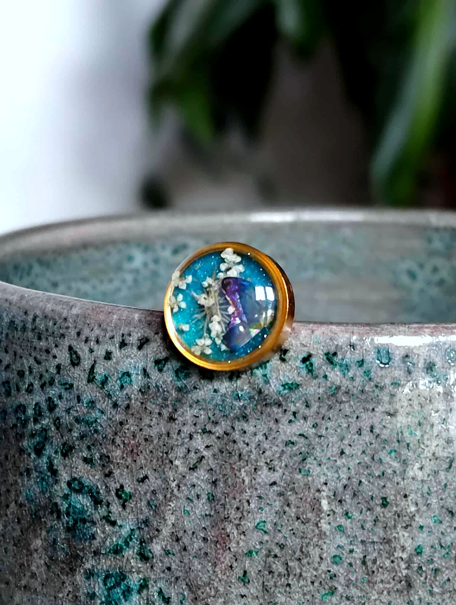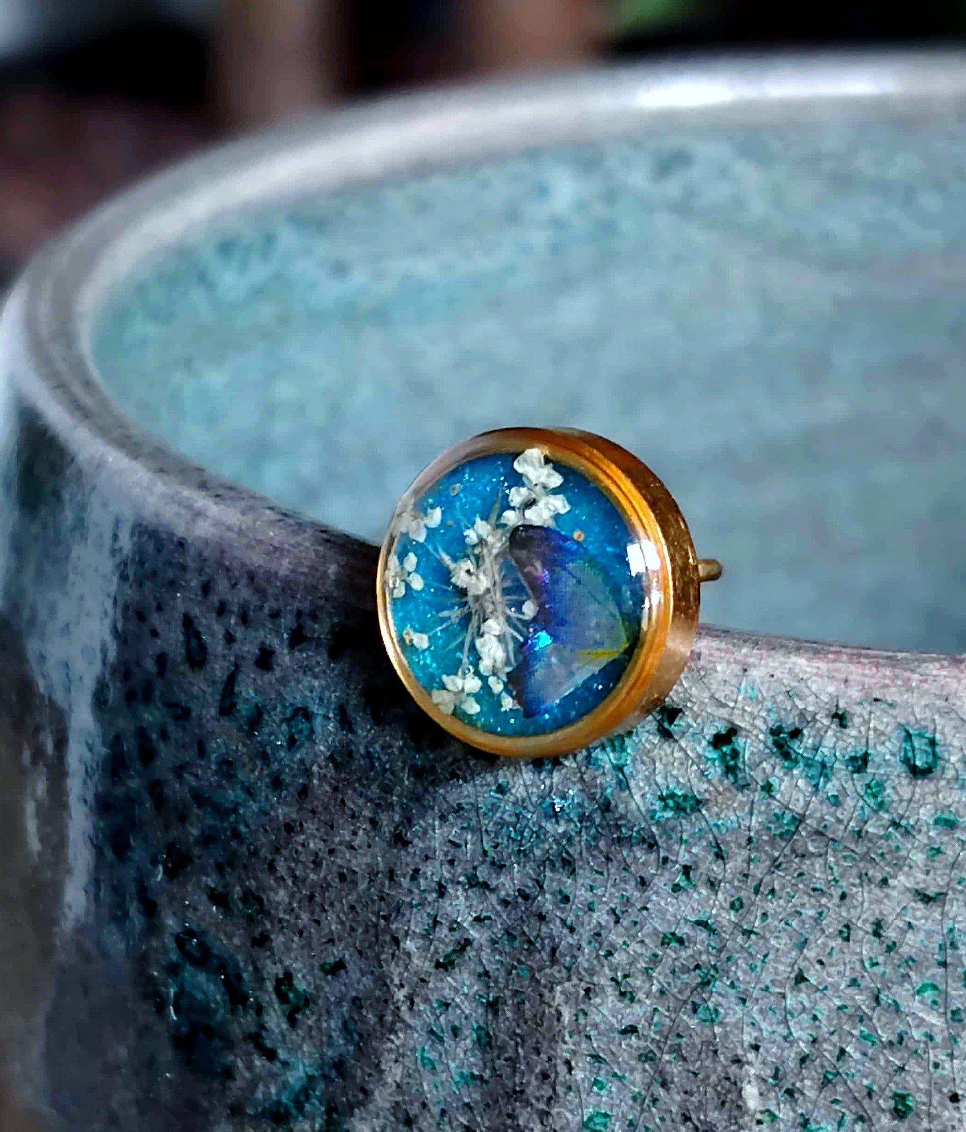 Le clou 8mm de diamètre est composé d'un éclat de fleur de carotte sauvage et d'un fond turquoise avec paillette une gommette papillon figés dans la résine époxy (de marque française et de haute qualité)