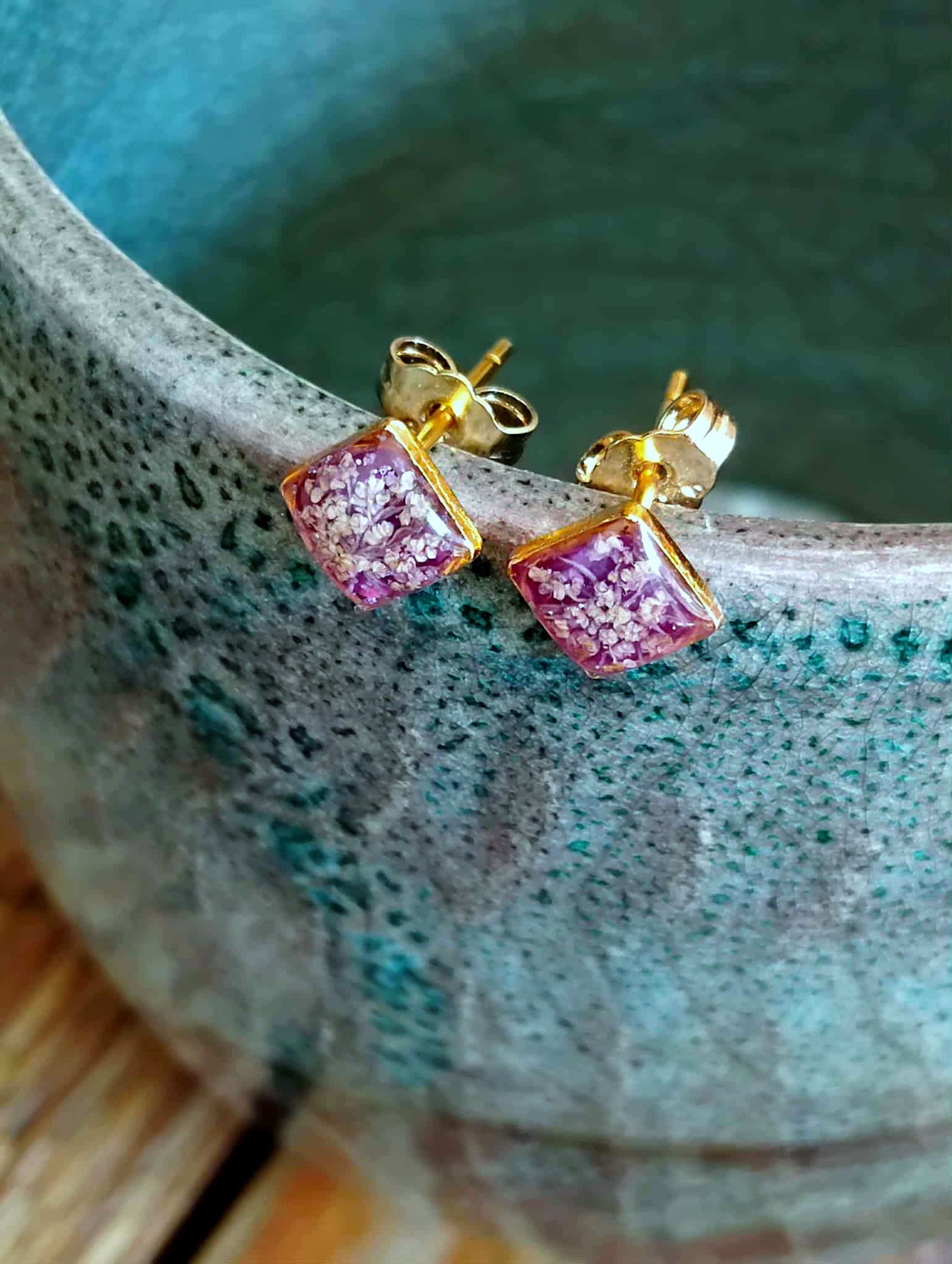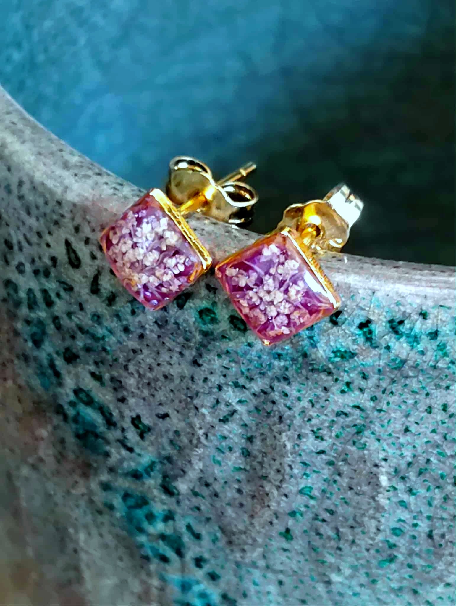 Les clous carré de 5mm de coté sont composés d'un éclat de fleur de carotte sauvage et d'un fond rose/violet figés dans la résine époxy (de marque française et de haute qualité)