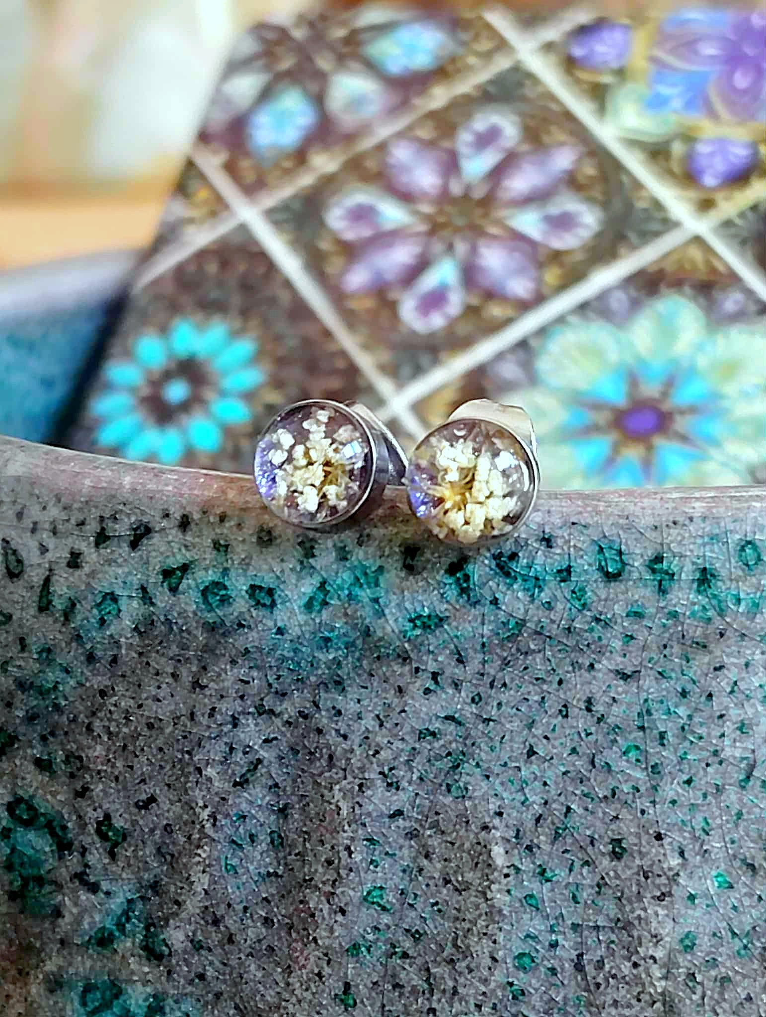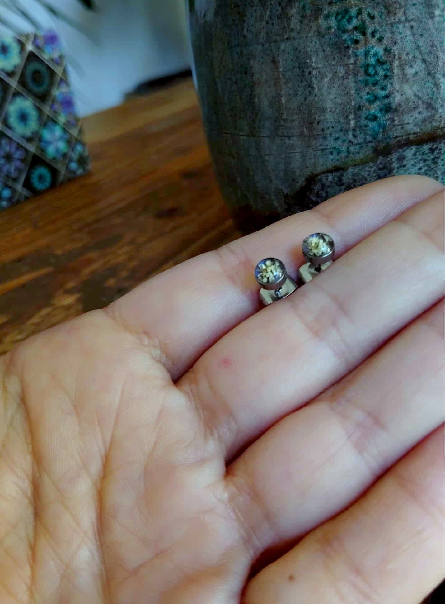 Les clous de 3mm de diamètre sont composés d'un éclat de fleur de carotte sauvage et d'un fond violet figés dans la résine époxy (de marque française et de haute qualité)