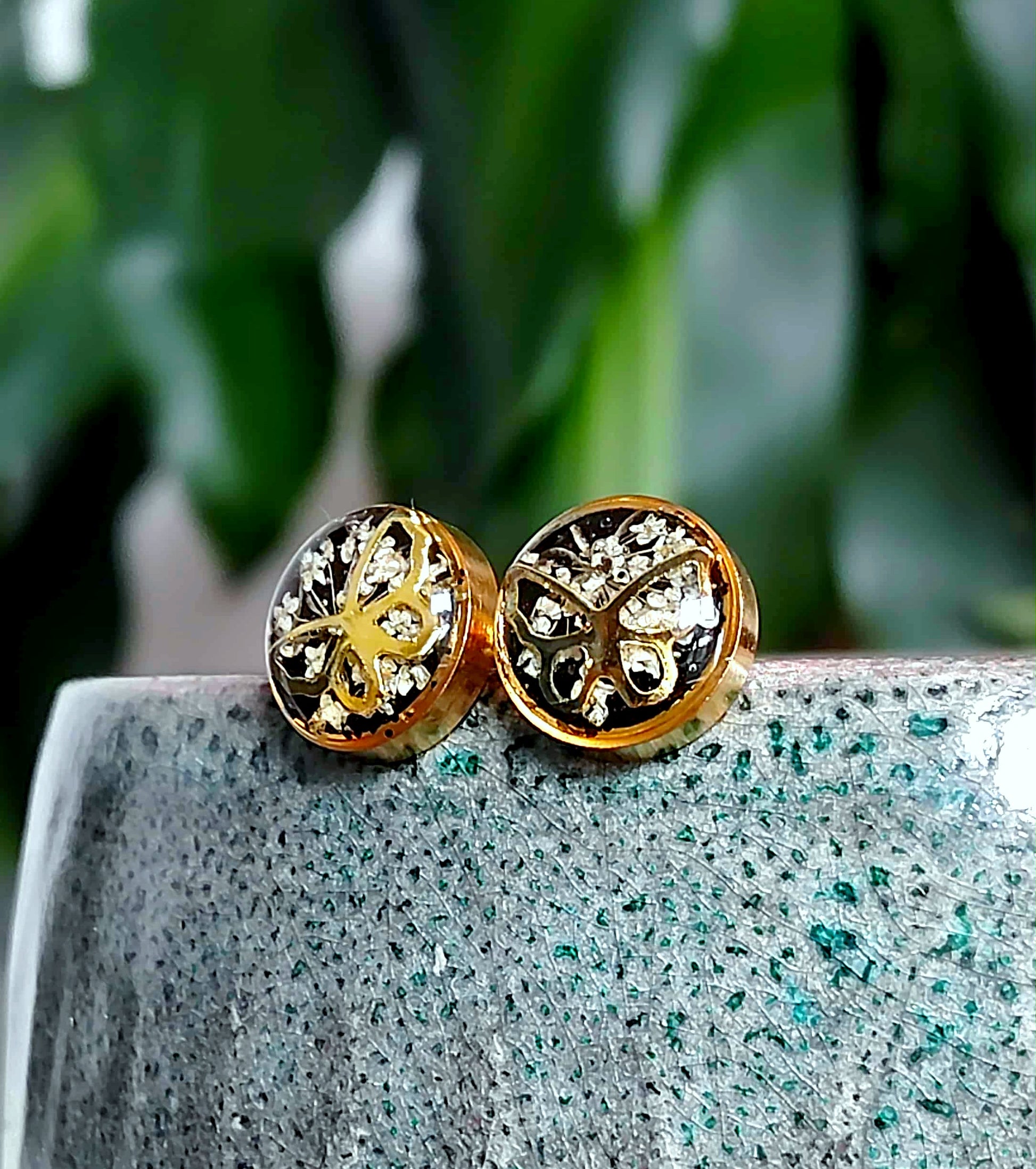Les clous 8mm de diamètre sont composés d'un éclat de fleur de carotte sauvage, d'un fond noir et d'un papillon doré figés dans la résine époxy (de marque française et de haute qualité)