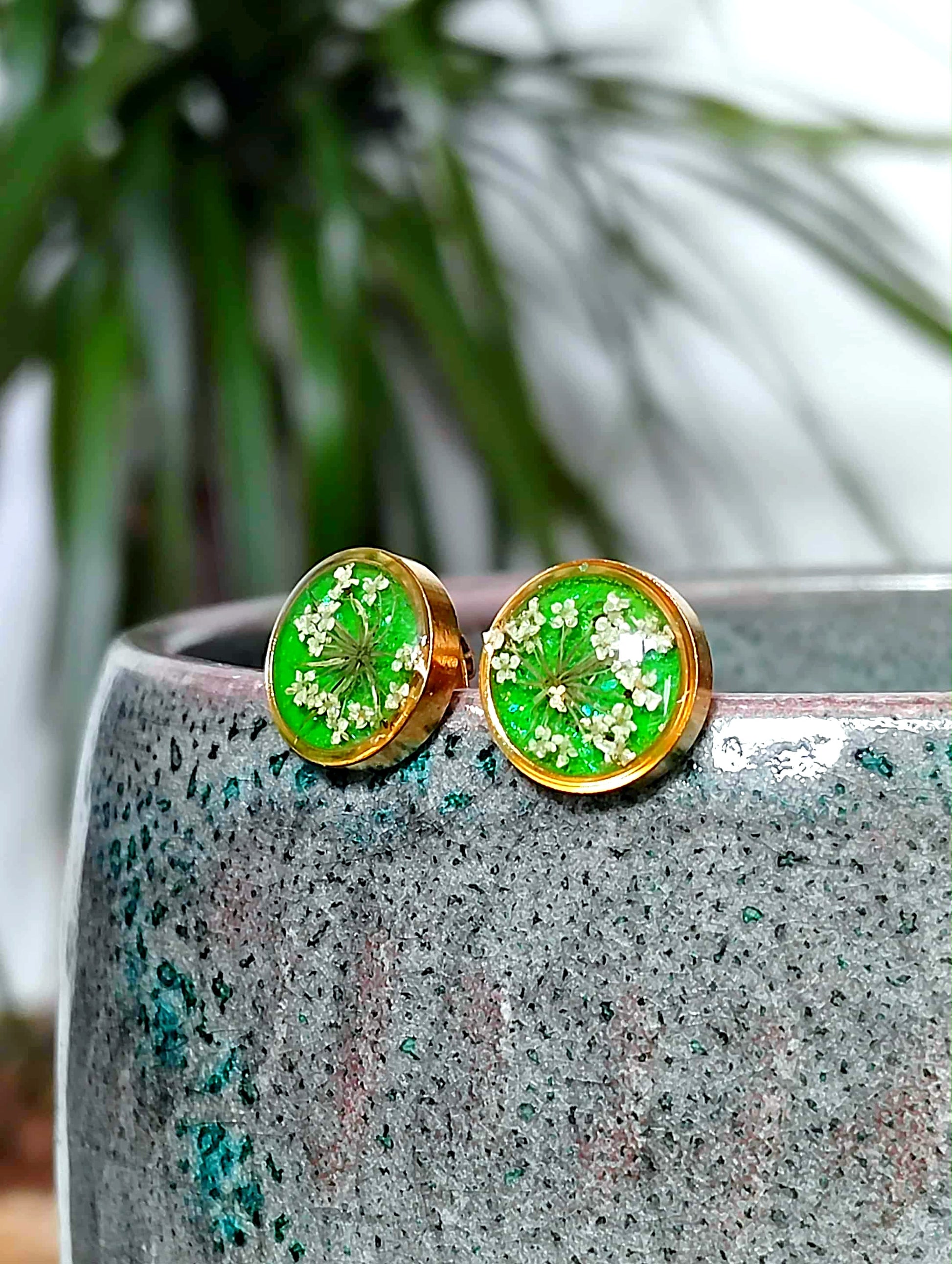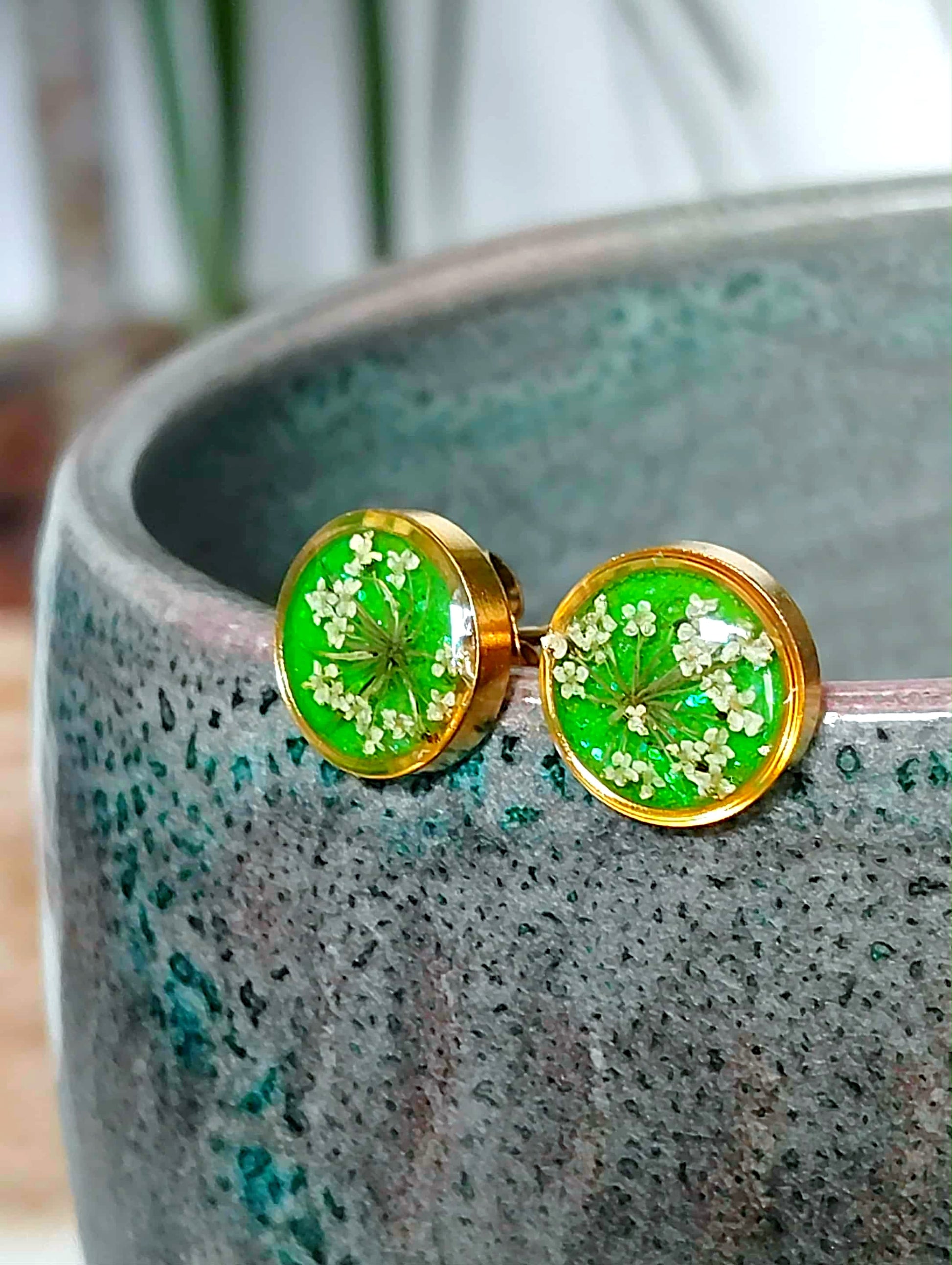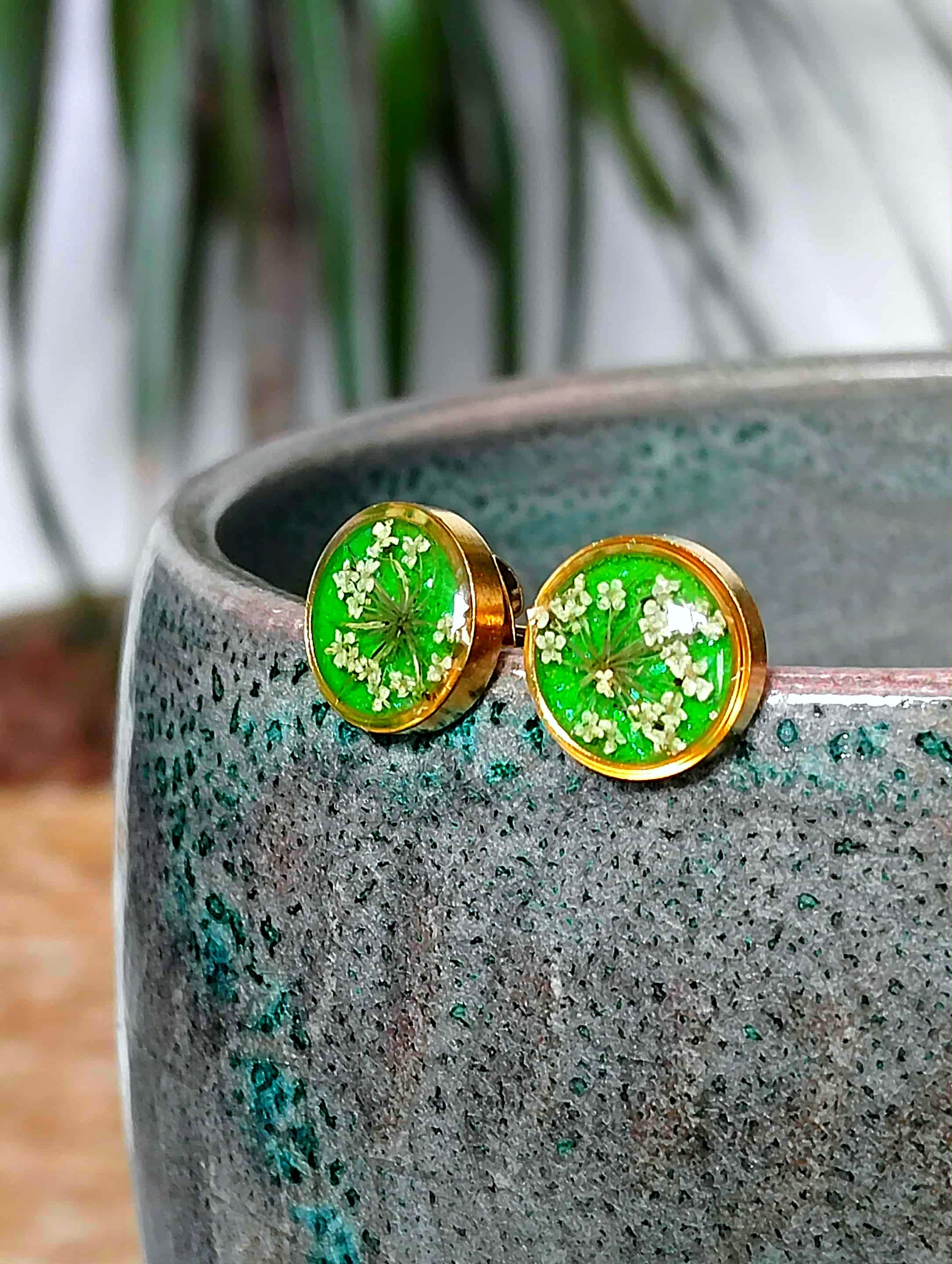 Les clous 8mm de diamètre sont composés d'un éclat de fleur de carotte sauvage et d'un fond vert anis avec paillette figés dans la résine époxy (de marque française et de haute qualité)
