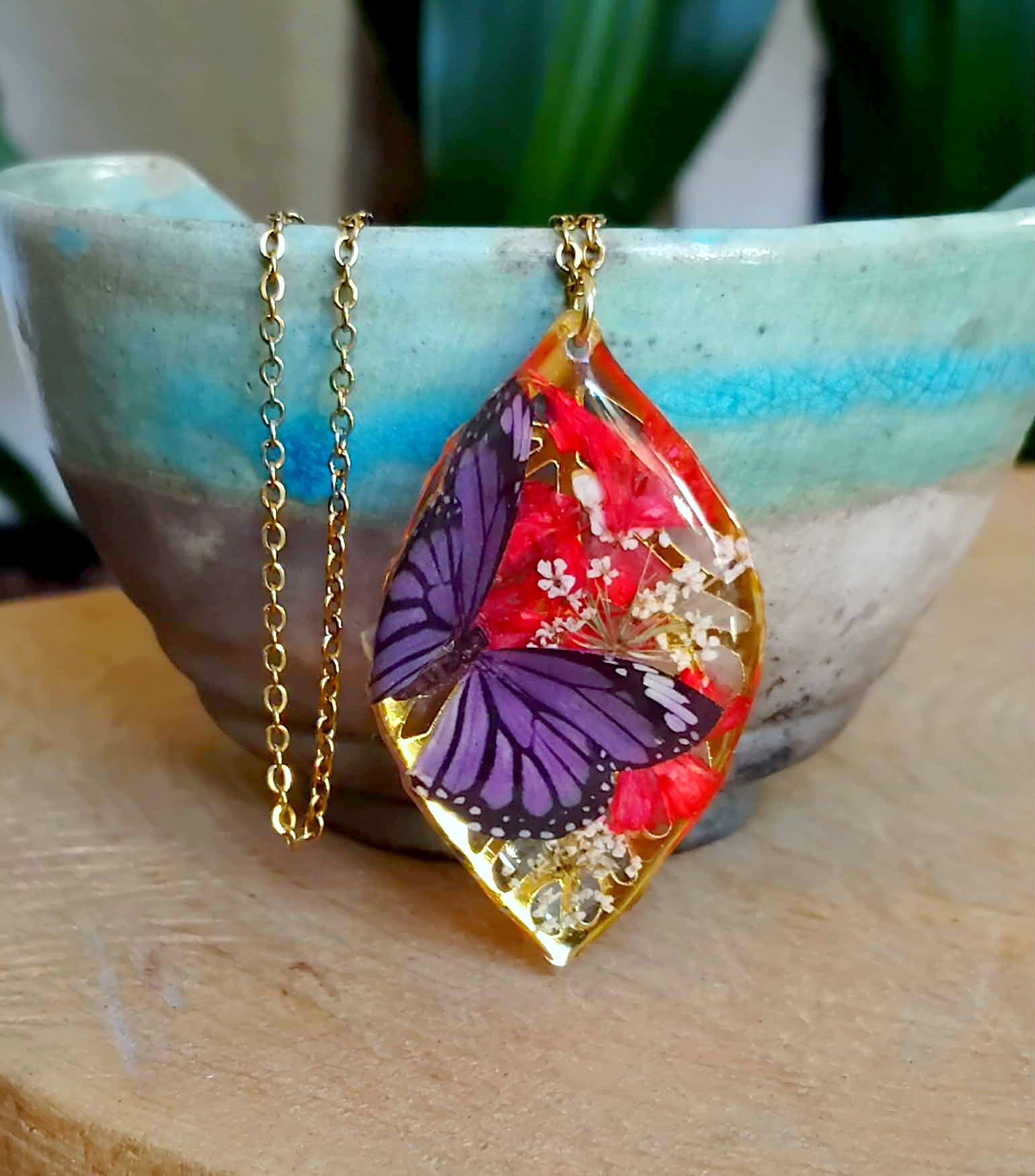 Il se compose de fleur de carotte sauvage, de statice sinué teinté en bordeaux et d'une gommette papillon