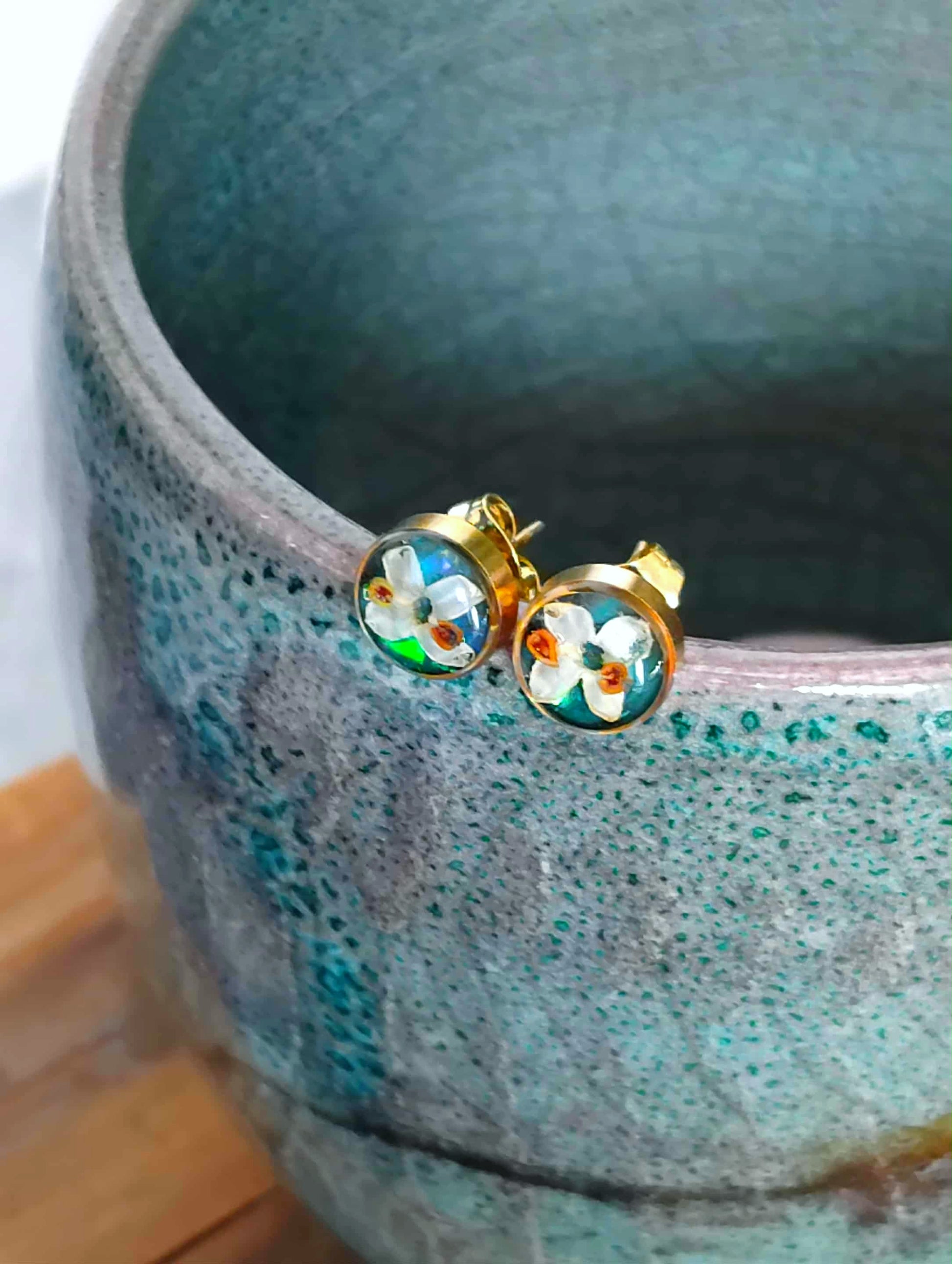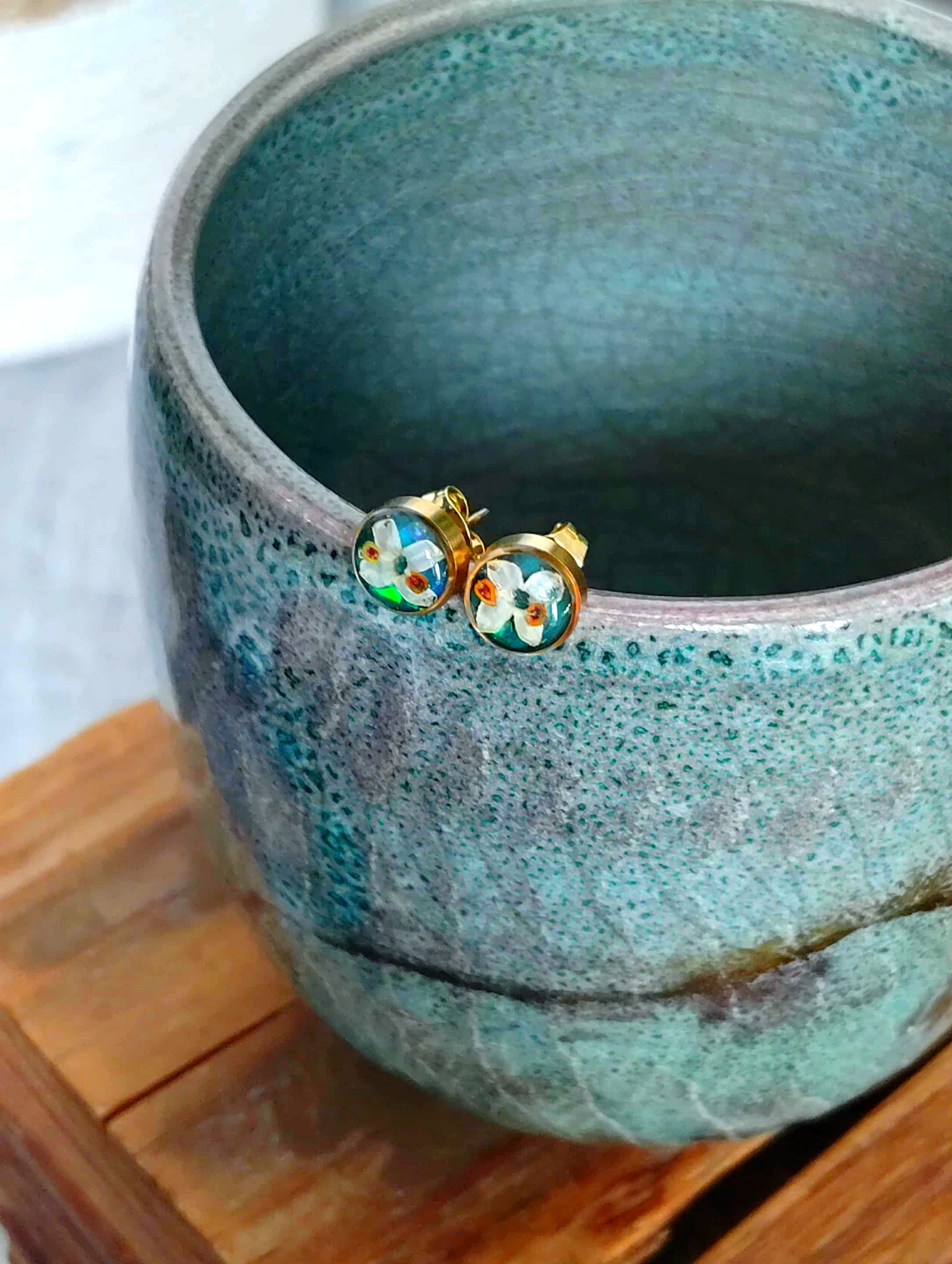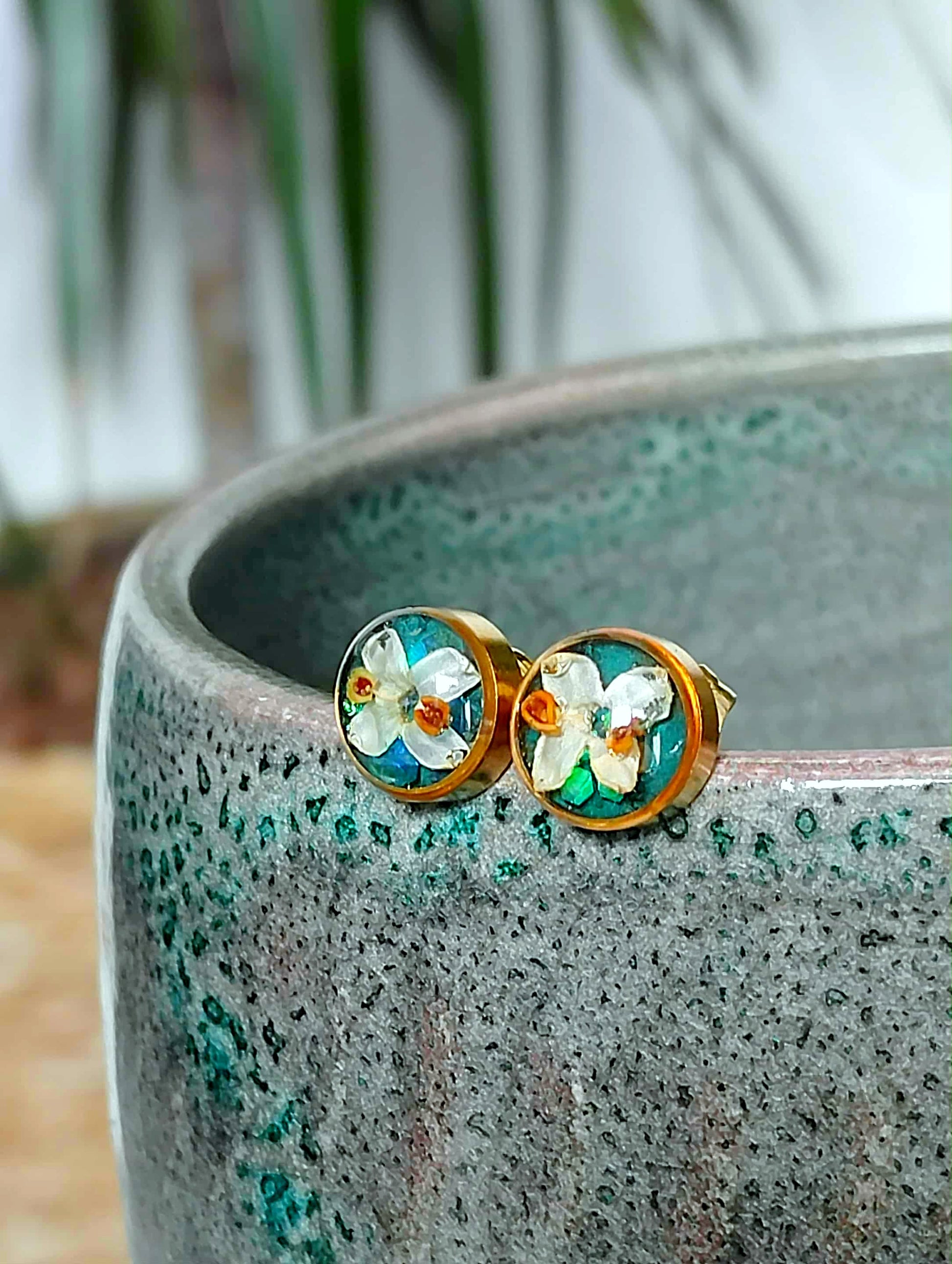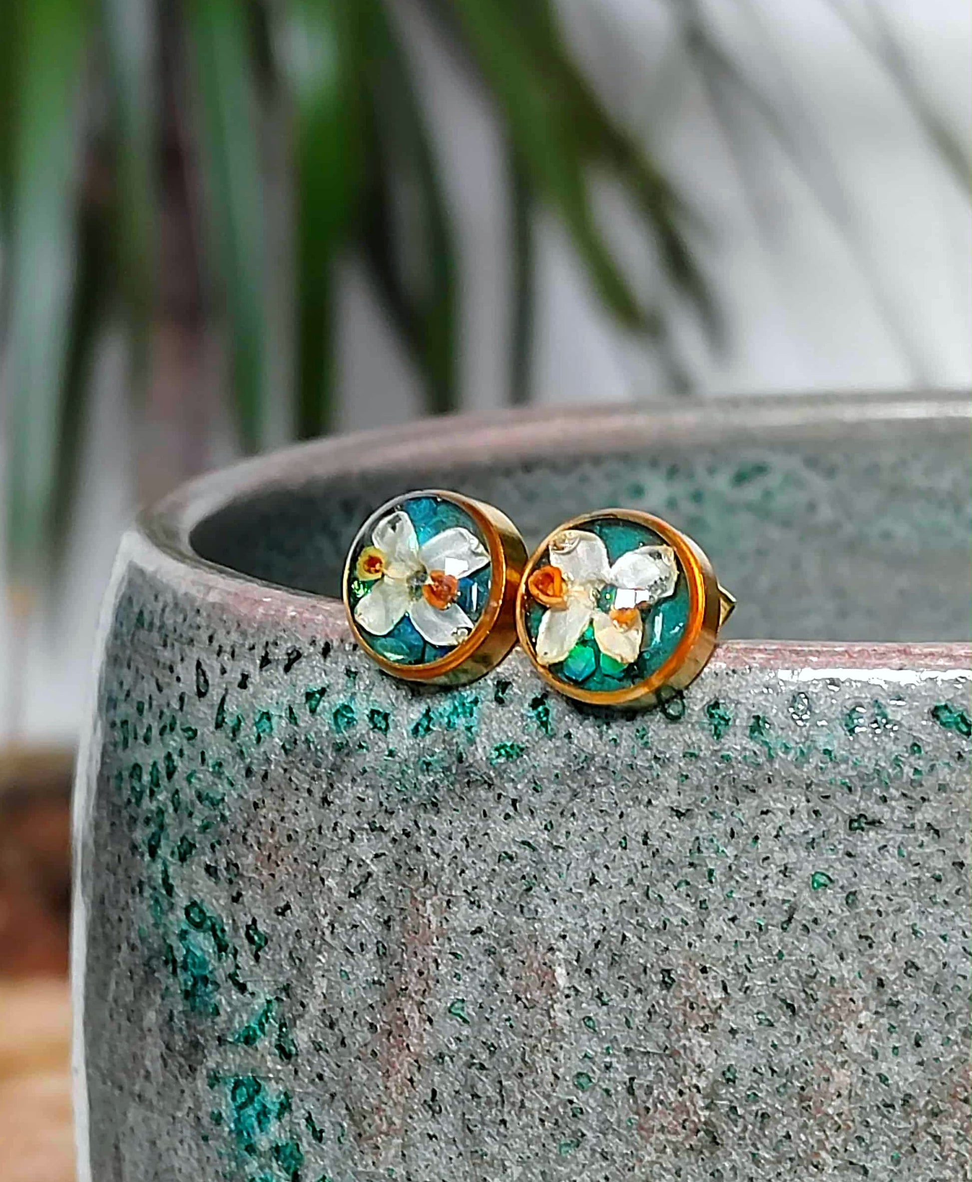 Les clous 6mm de diamètre sont composés d'une fleur d'olivier et d'un fond turquoise avec paillette à reflet figés dans la résine époxy (de marque française et de haute qualité)