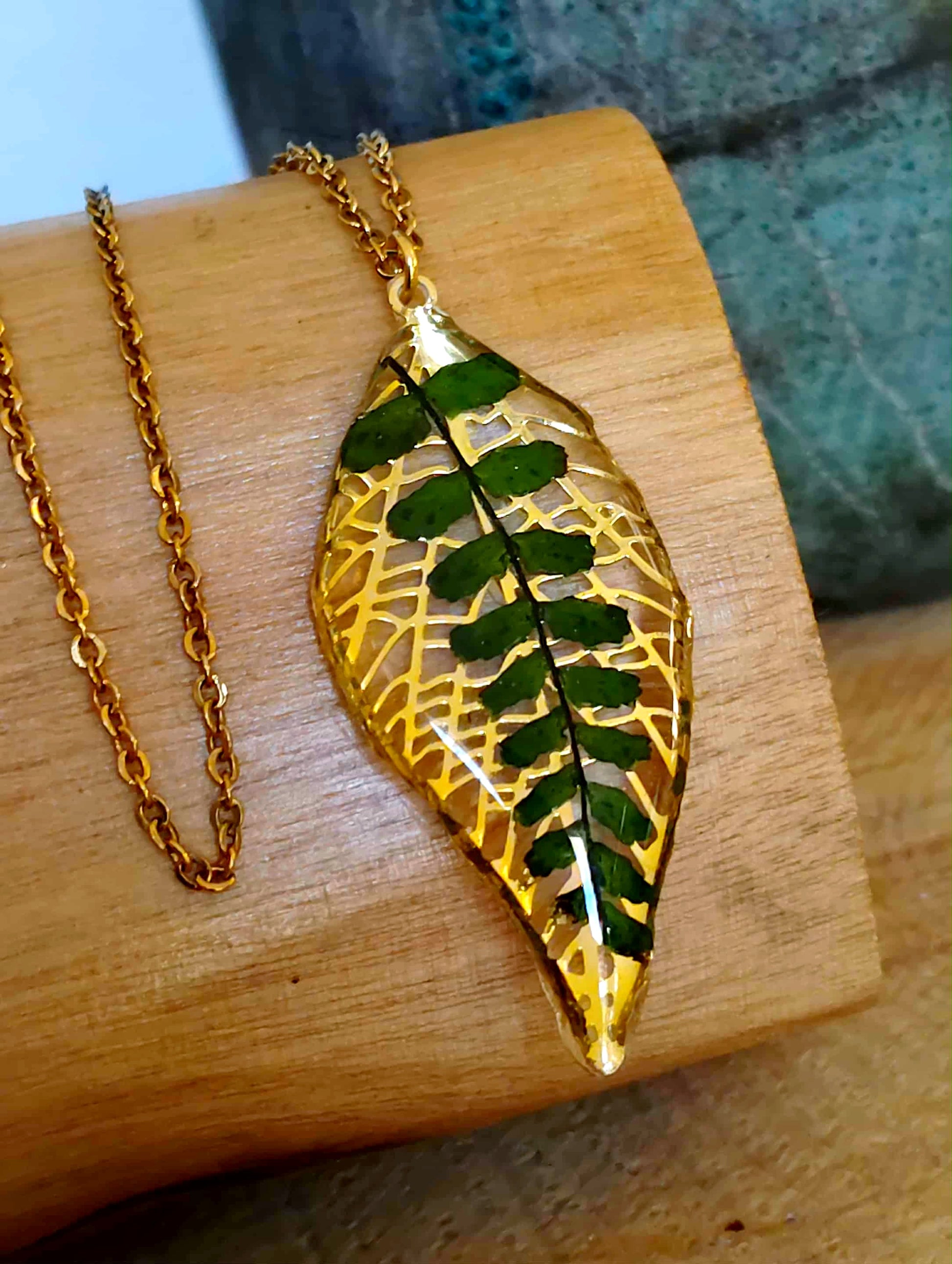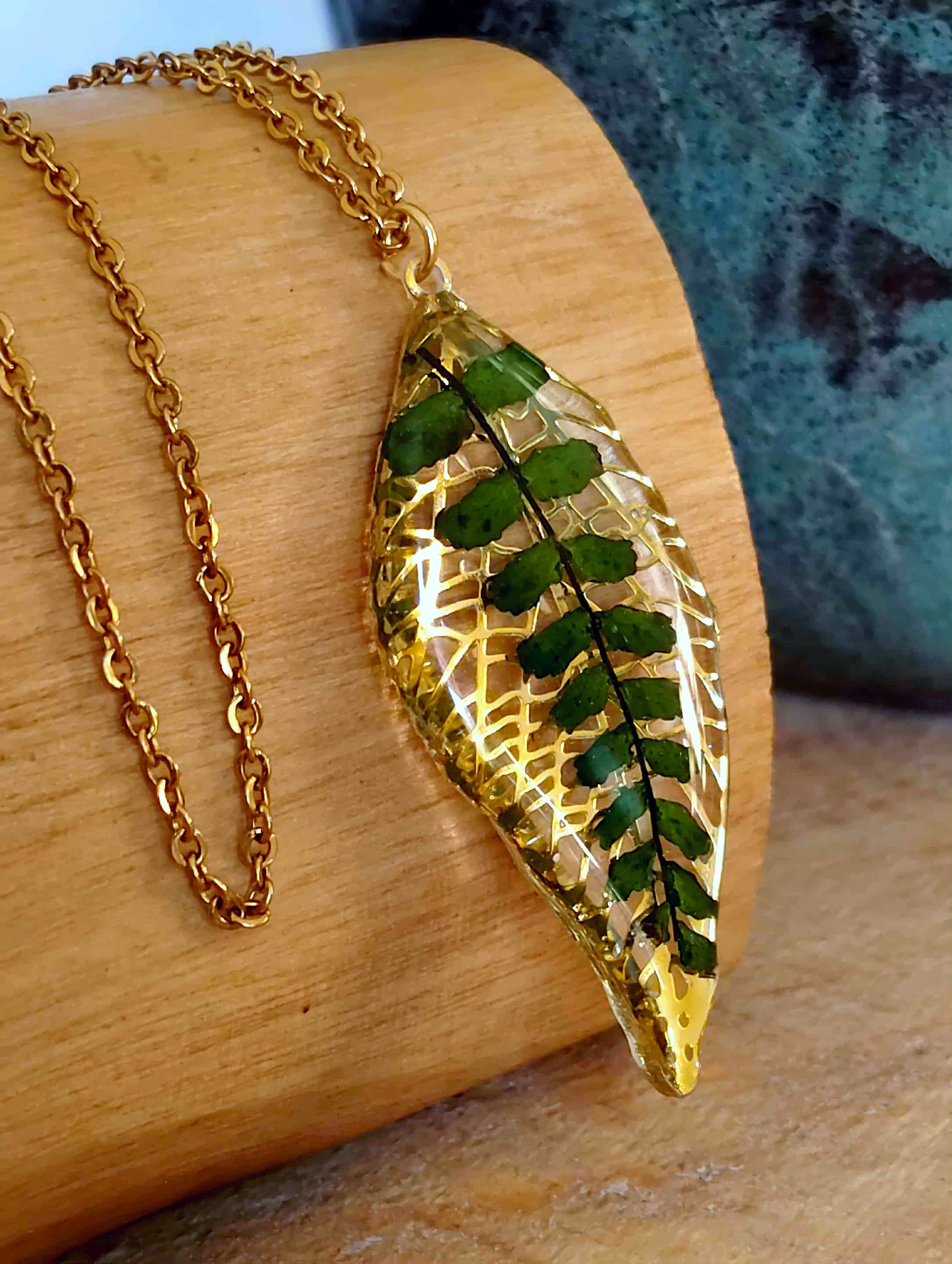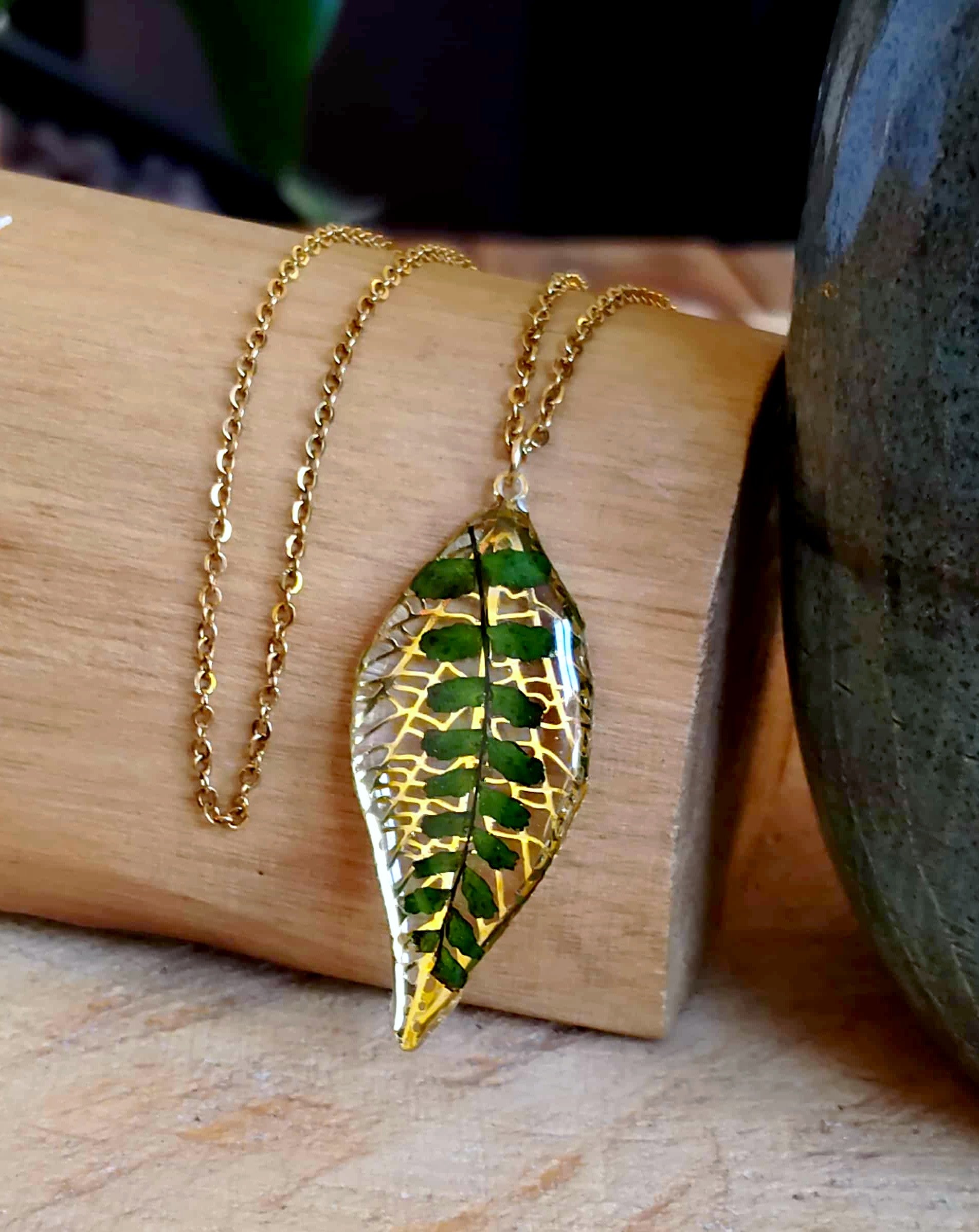 Pendentif Feuille de 4cm de long en acier inox recouvert de résine époxy de marque française et de haute qualité