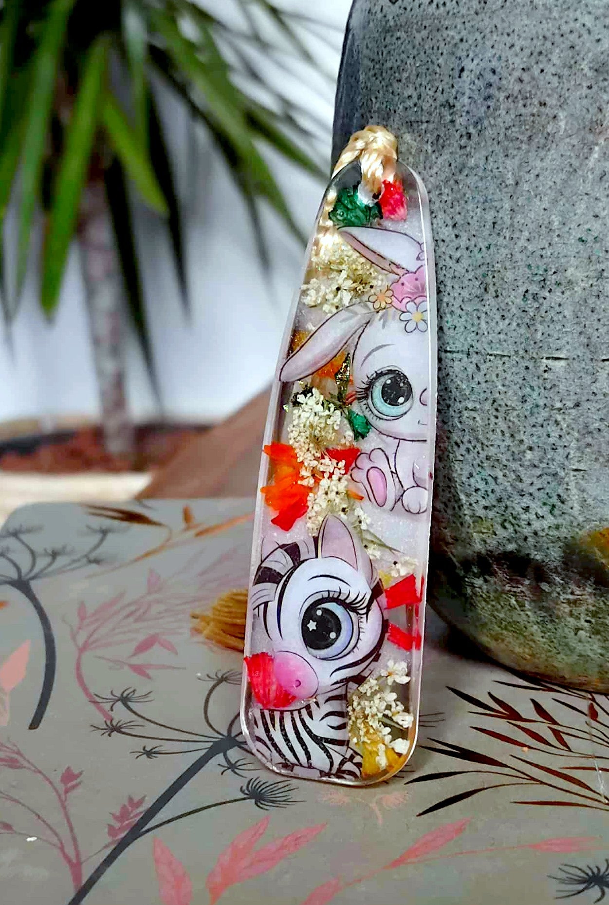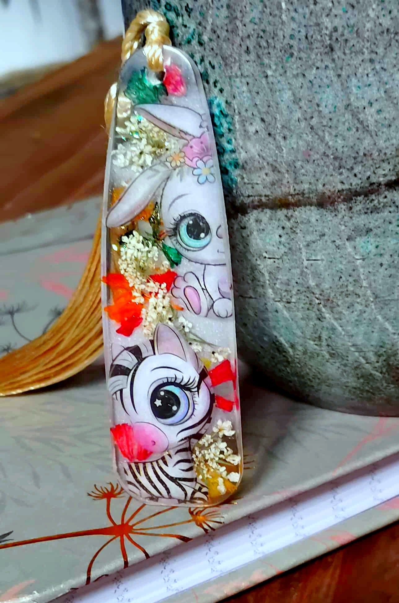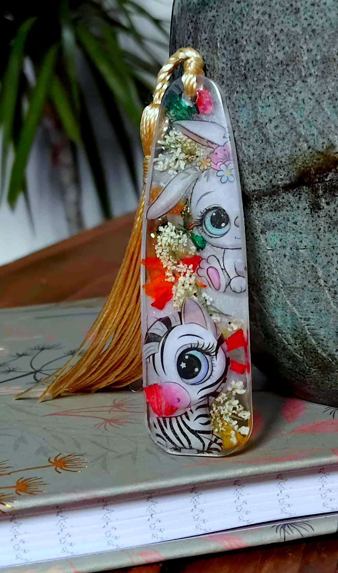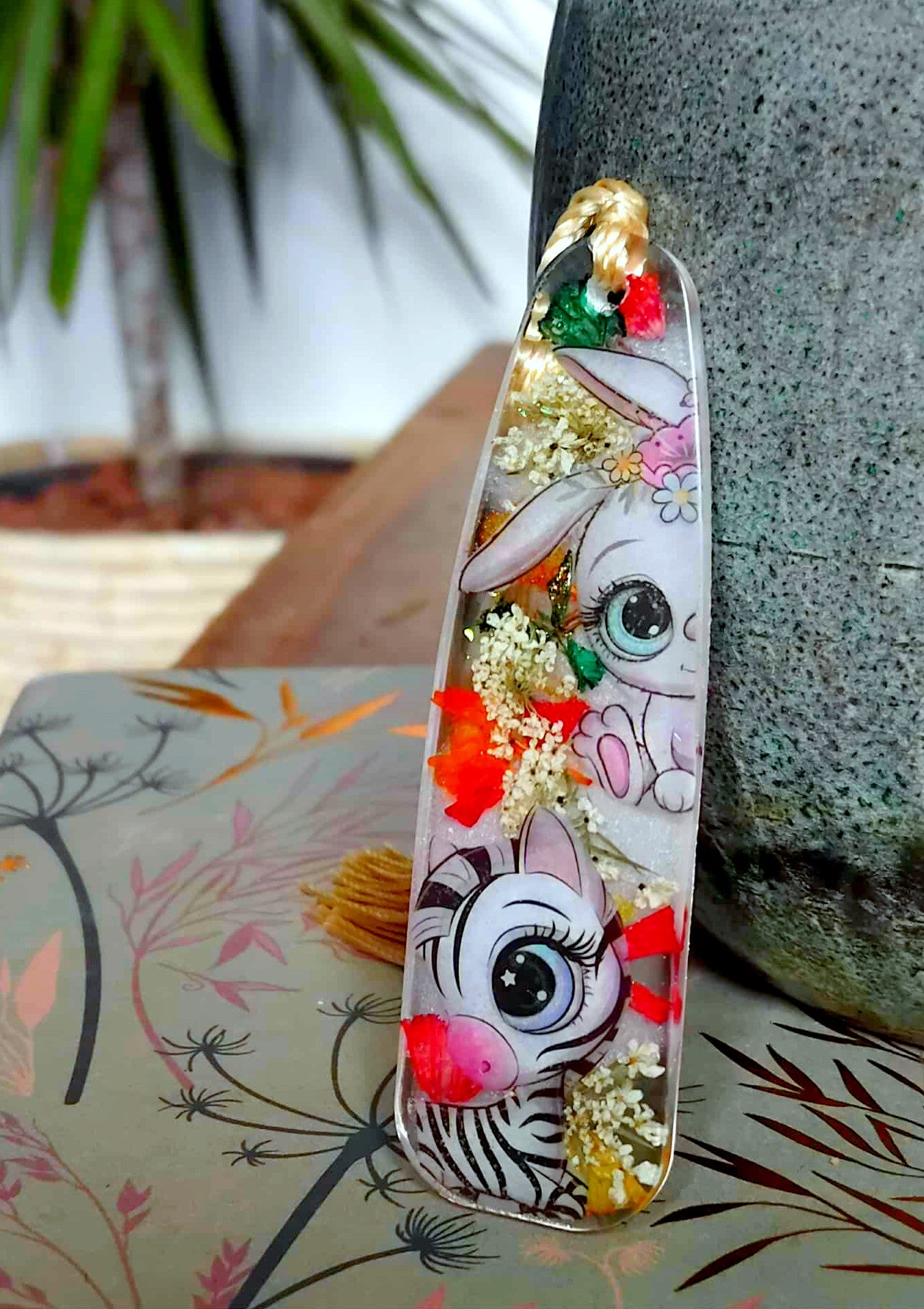 Le marque page est un rectangle de 7cm de long et de 2,5 cm au plus large est en résine époxy de marque française et de haute qualité